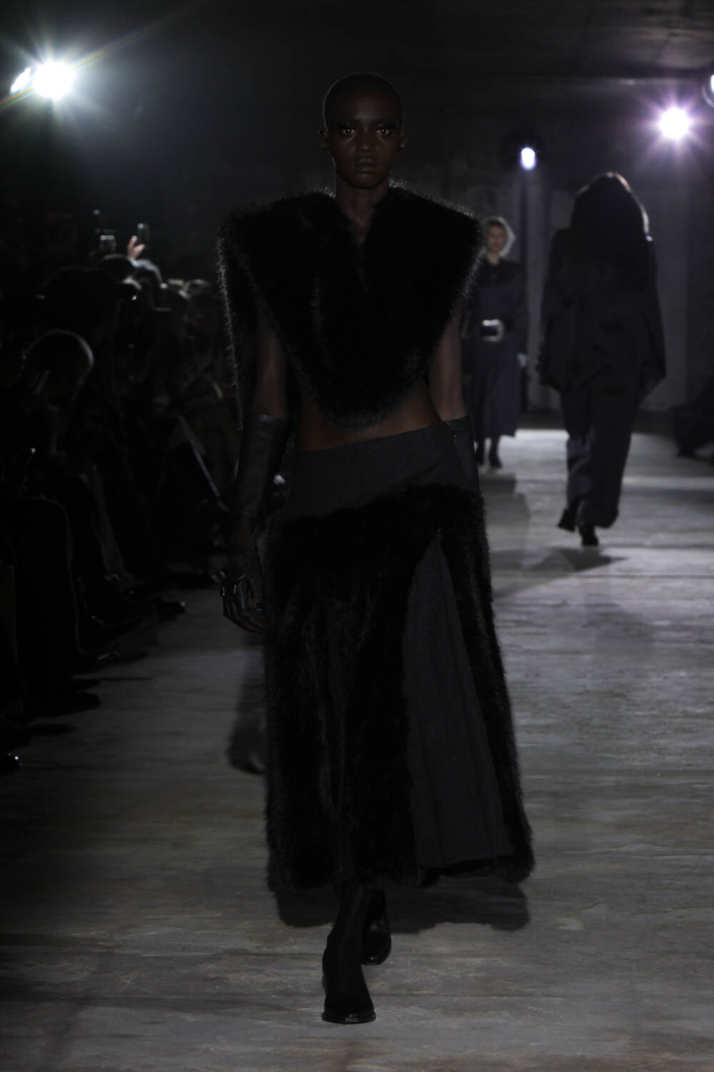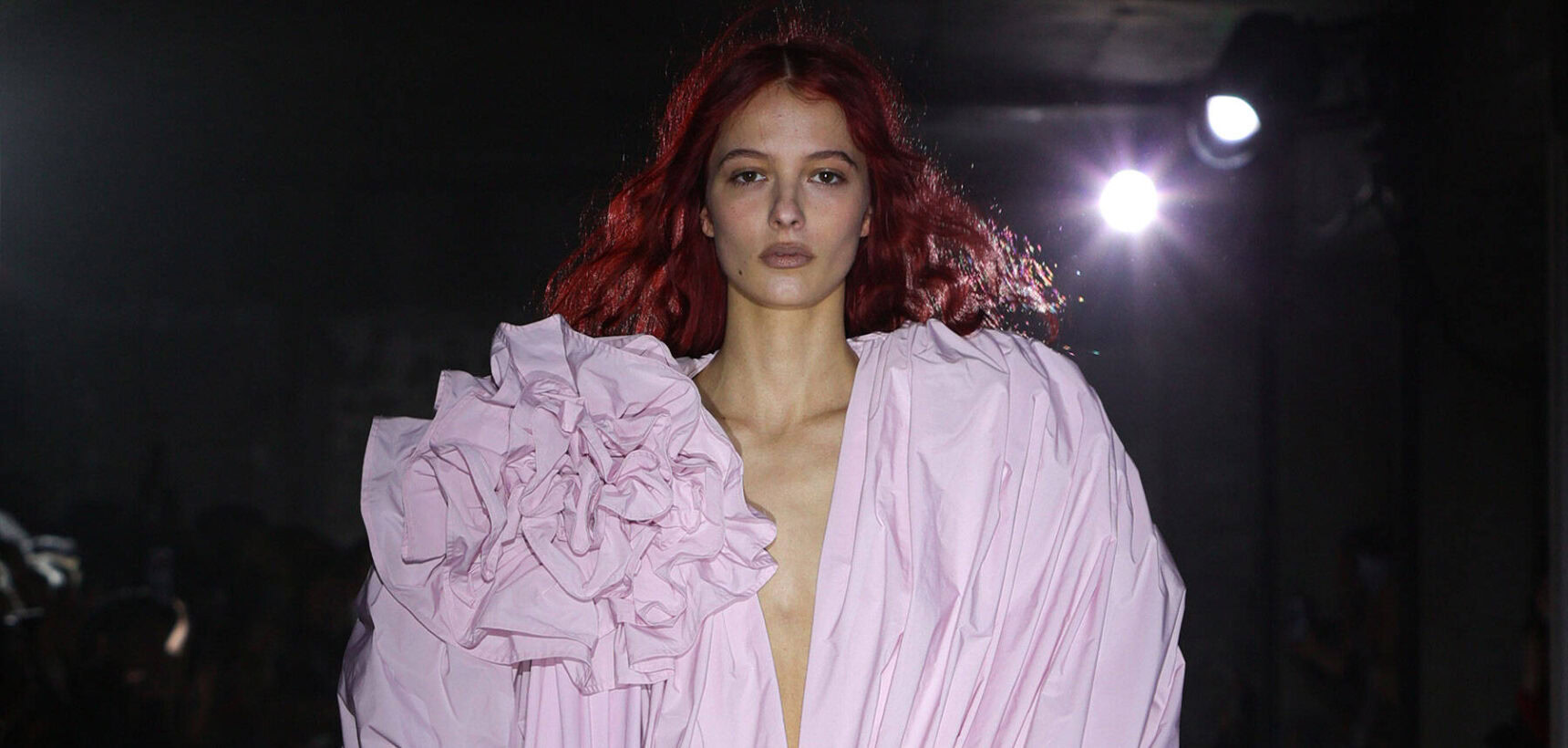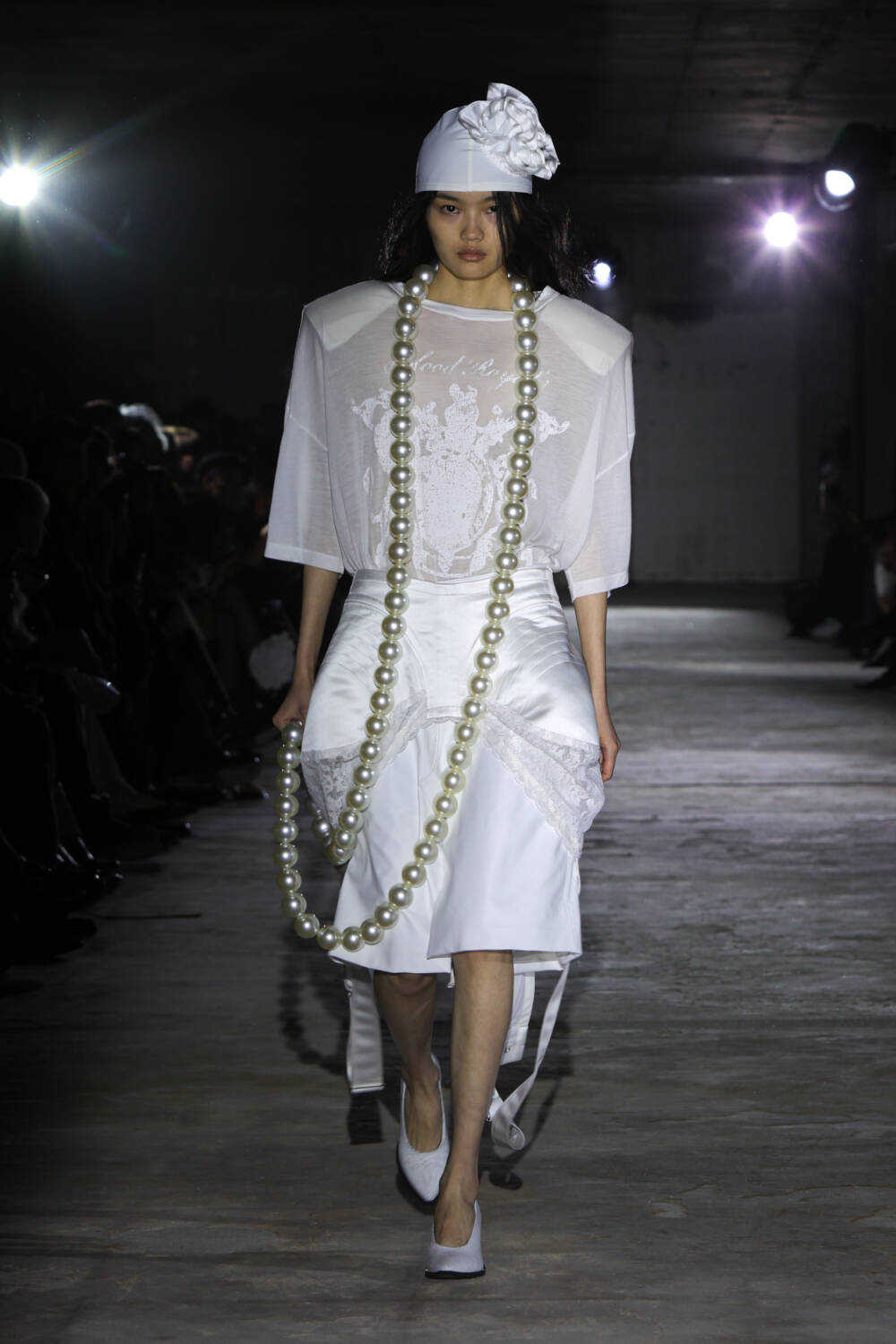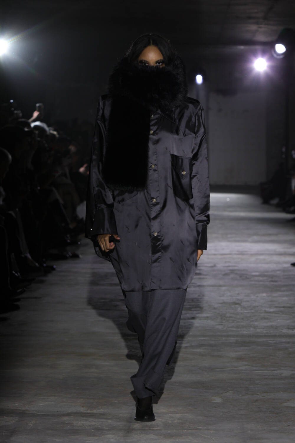 With a focus on wearability, silhouettes – inspired by 1920s and ‘80s Americana – were oversized and exaggerated from lapels and belts to colossal faux fur coats and bulbous taffeta pouf dresses (adding pops of pink and white to the otherwise muted line-up) – almost everything was blown up to cartoonish proportions. Gargantuan pearl necklaces, for example, were slung over entire outfits, commanding attention and adding a touch of antiquated opulence. In that same vein, a mid-century-style brassiere looked as if it’d been constructed for a giant, and was worn with the model’s head through the arm strap and the cups careening off the body like a fluid tunic as opposed to a piece of lingerie.