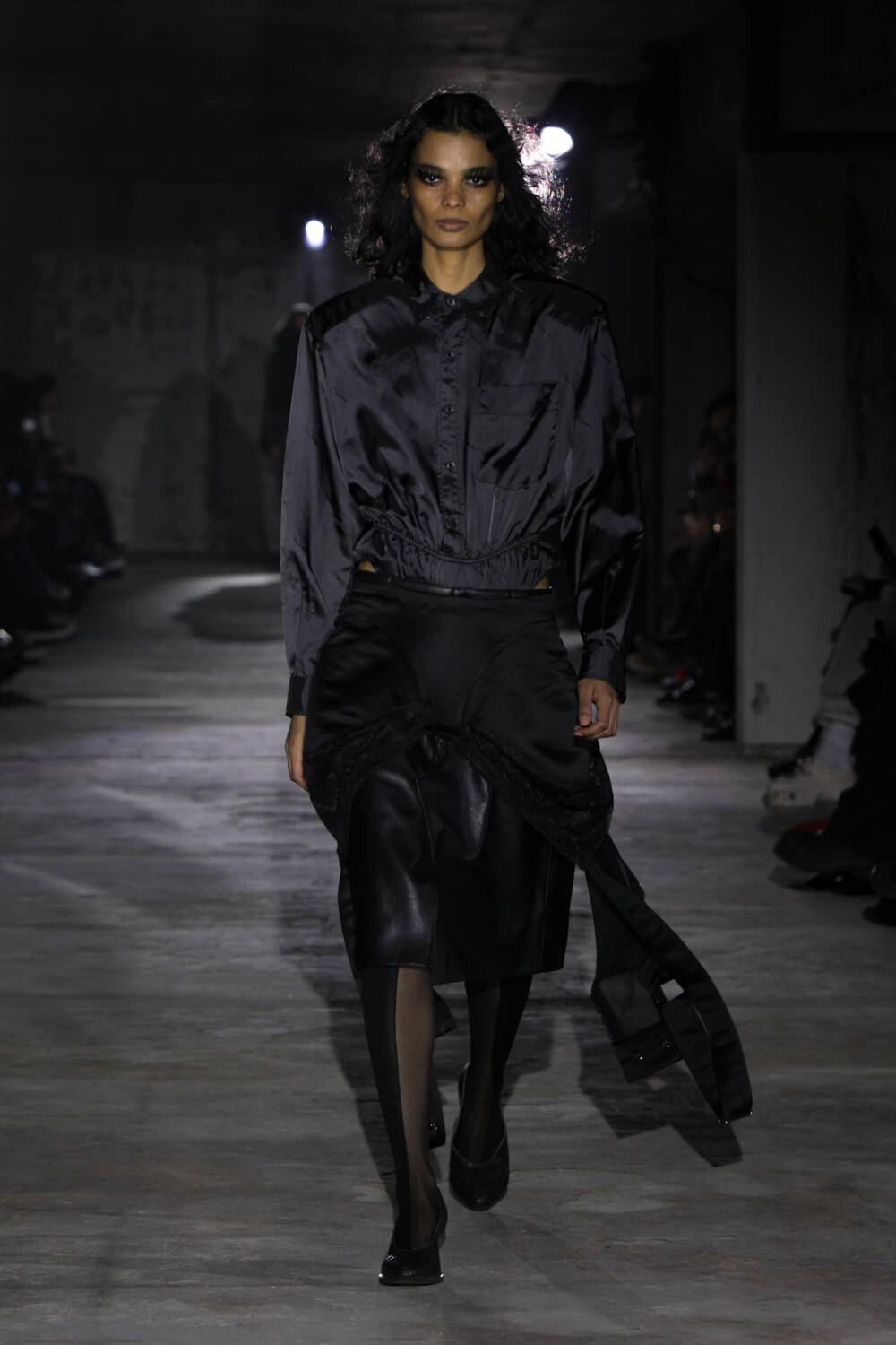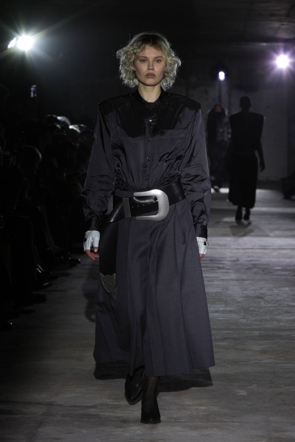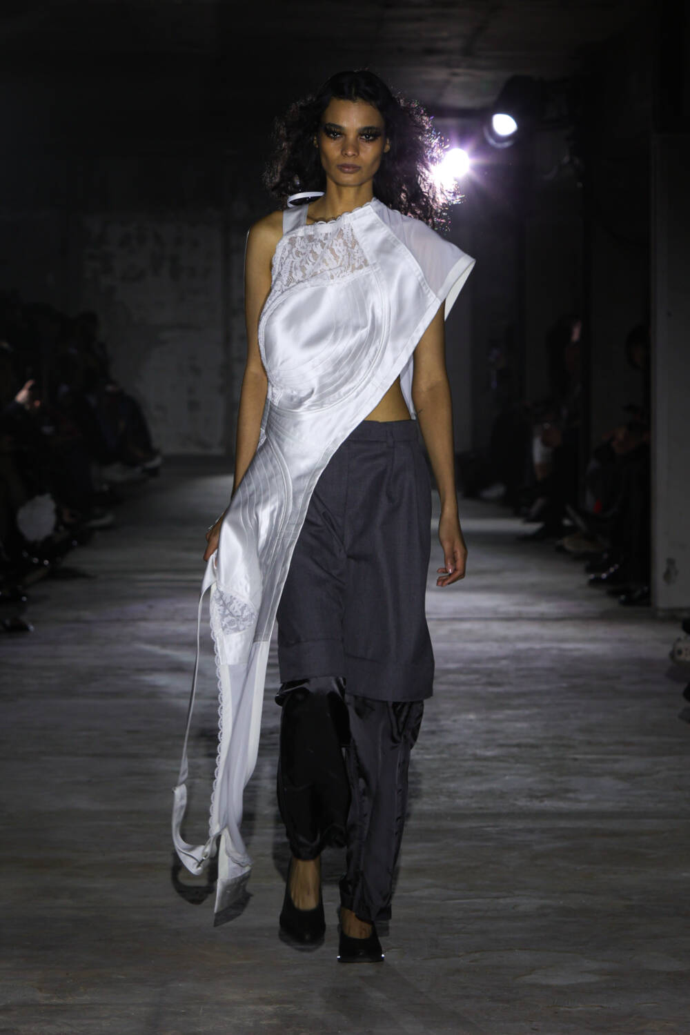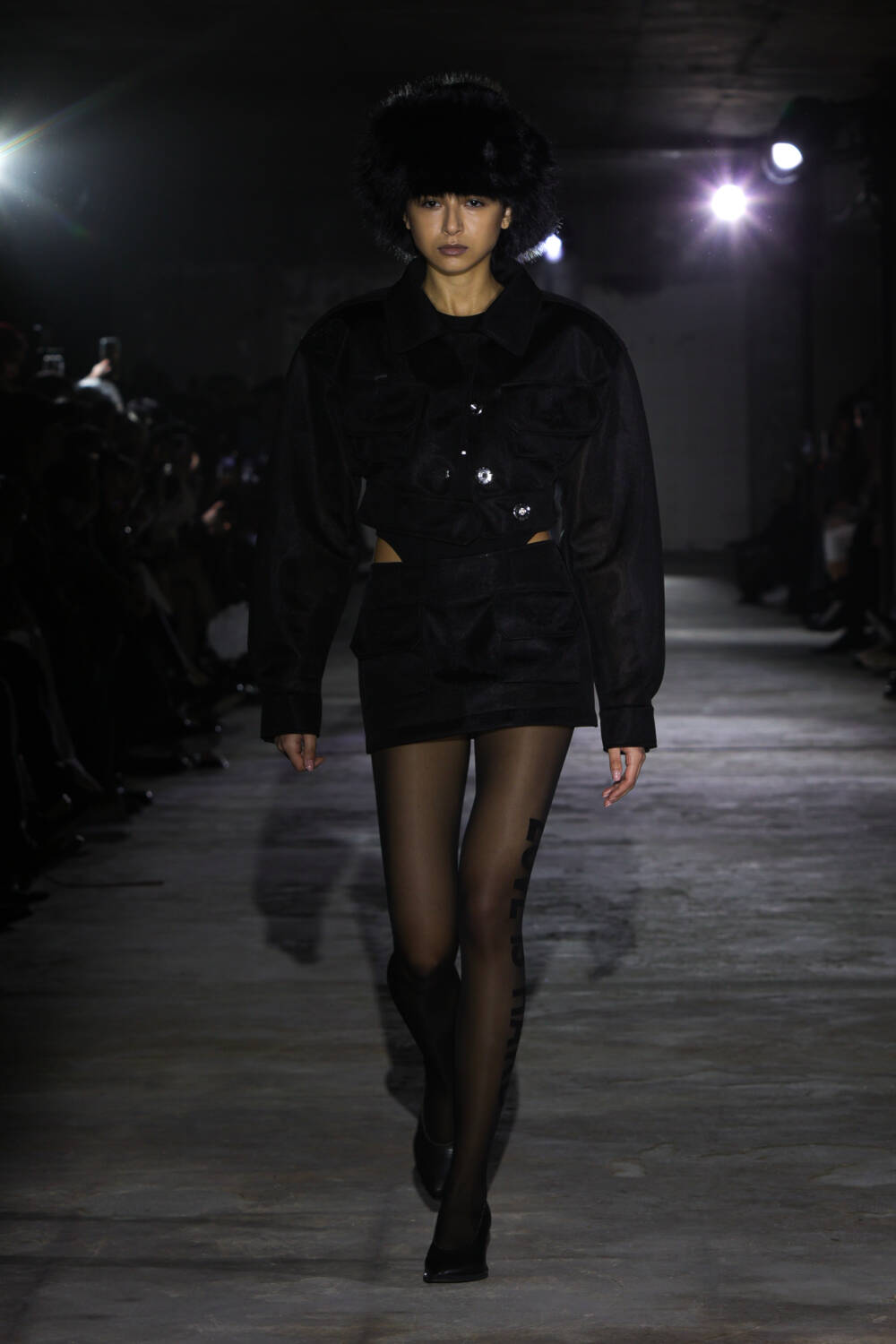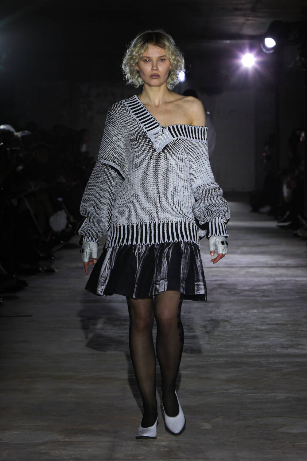 With a focus on wearability, silhouettes – inspired by 1920s and ‘80s Americana – were oversized and exaggerated from lapels and belts to colossal faux fur coats and bulbous taffeta pouf dresses (adding pops of pink and white to the otherwise muted line-up) – almost everything was blown up to cartoonish proportions. Gargantuan pearl necklaces, for example, were slung over entire outfits, commanding attention and adding a touch of antiquated opulence. In that same vein, a mid-century-style brassiere looked as if it’d been constructed for a giant, and was worn with the model’s head through the arm strap and the cups careening off the body like a fluid tunic as opposed to a piece of lingerie.