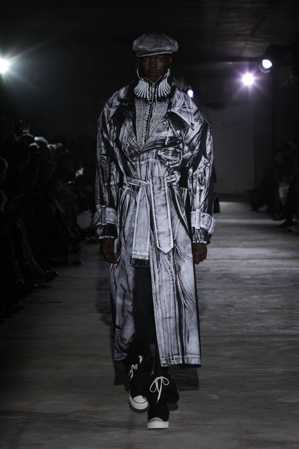 Elsewhere chunky knitwear, painted white, and trench coats with similar brushed-on effects added texture and depth. Leather pieces appeared in black or cracked dark grey adding a rugged edge, while faux fur packed a punch in lavish black and leopard prints.