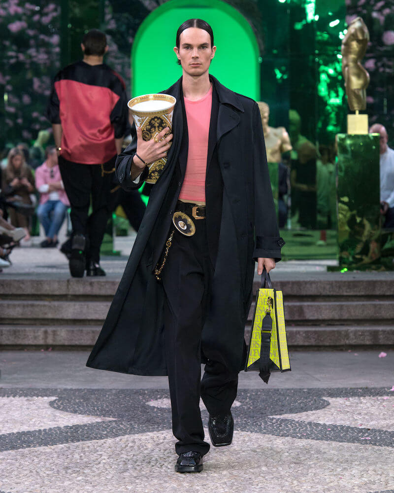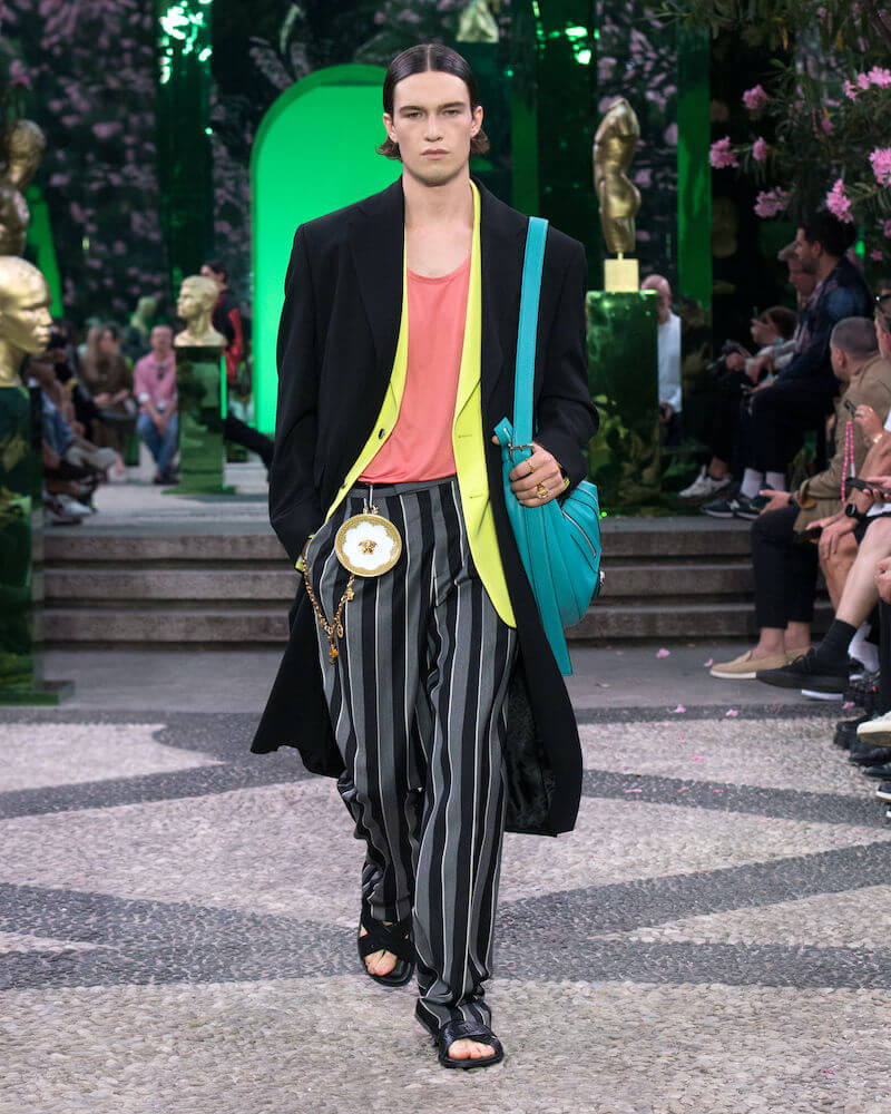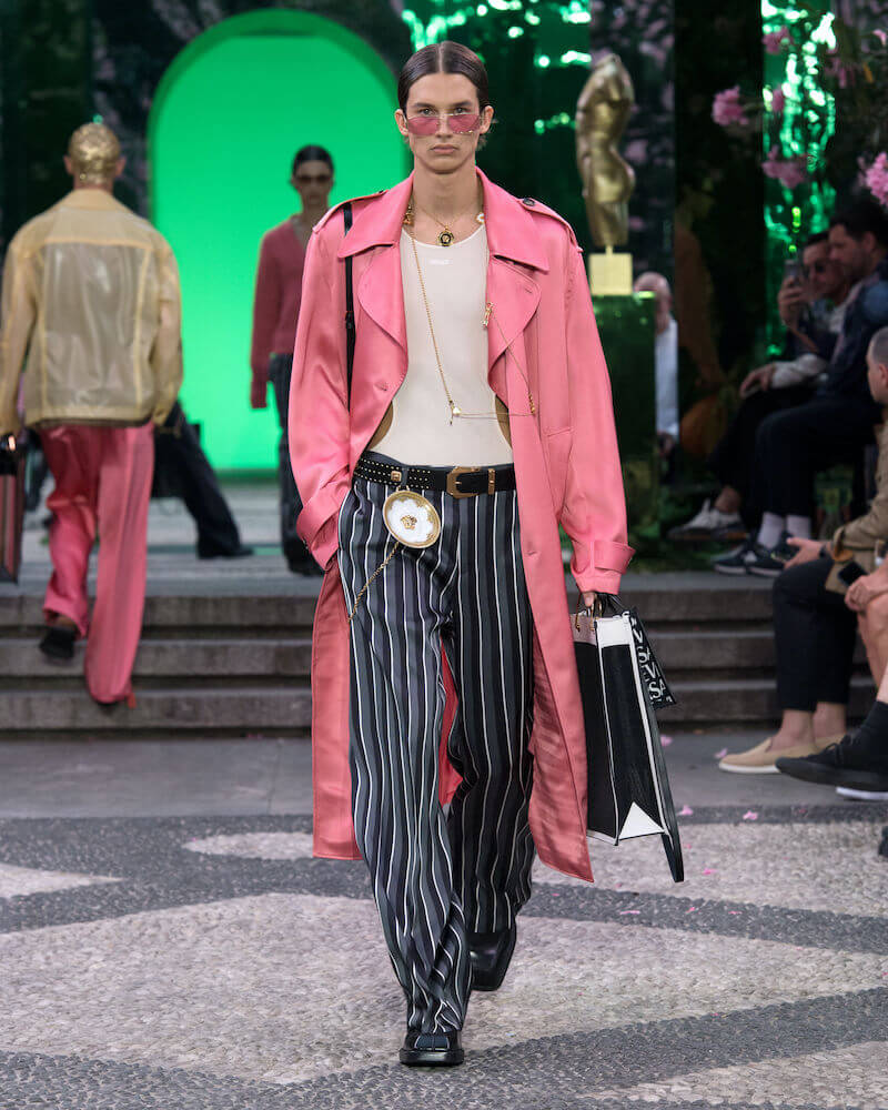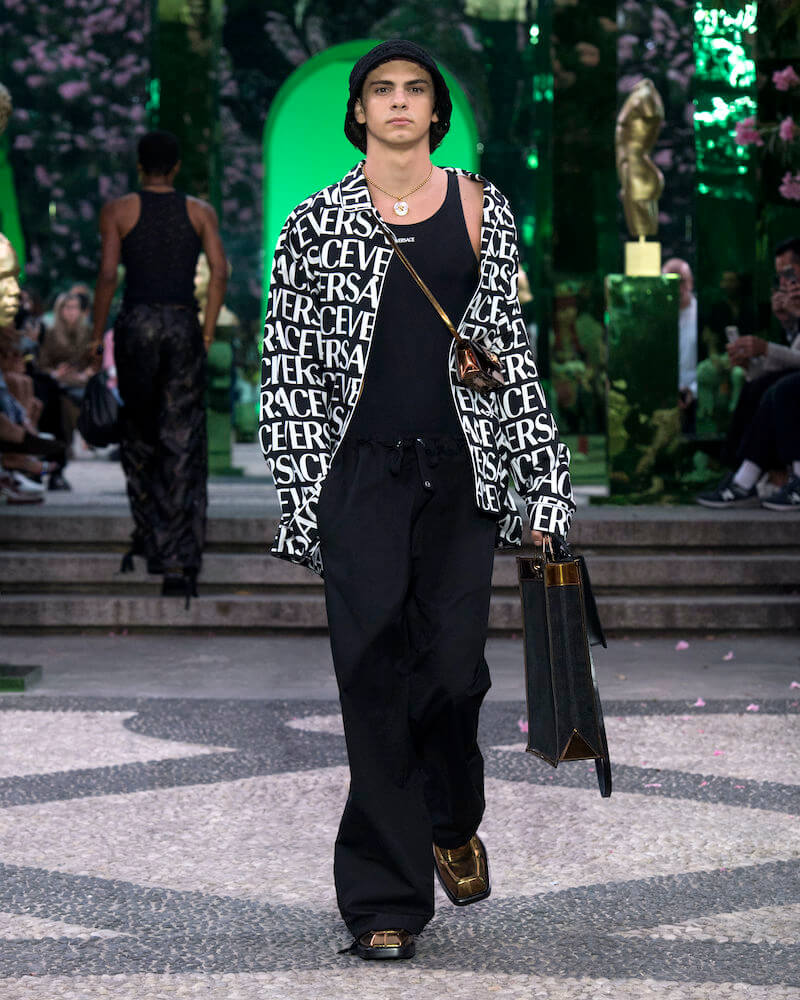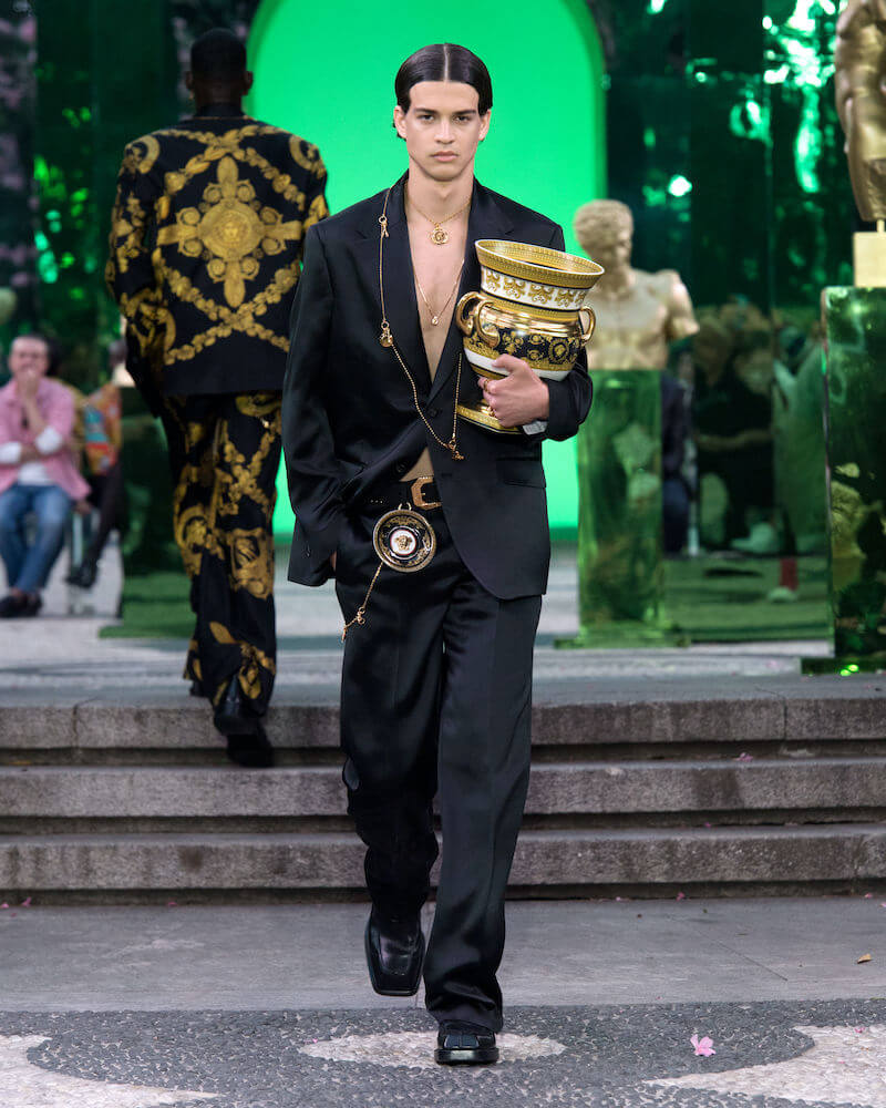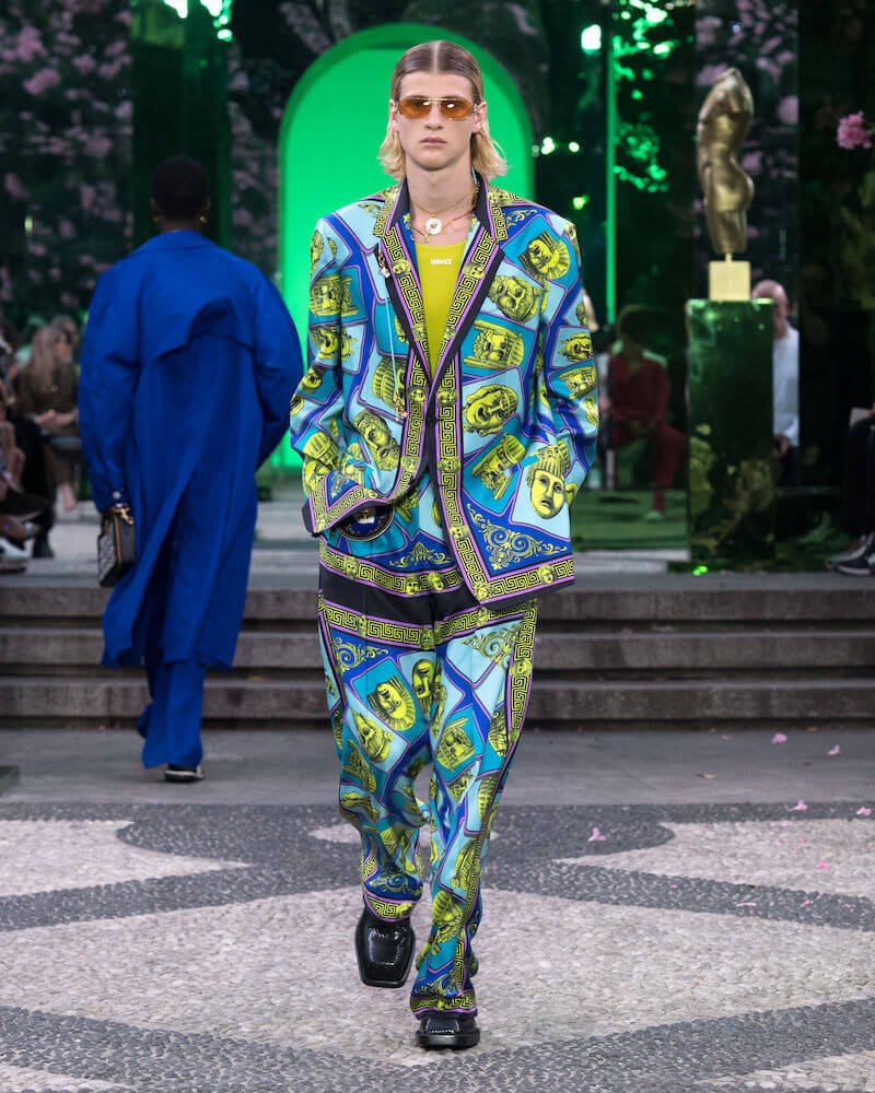 “When I work, I think of Generation Z and the freedom they have in not being afraid to mix contrasting pieces together,” said Donatella Versace in her shownotes. “Pop-art meets classicism—contrast like this is everything to me, it makes you think and feel.”