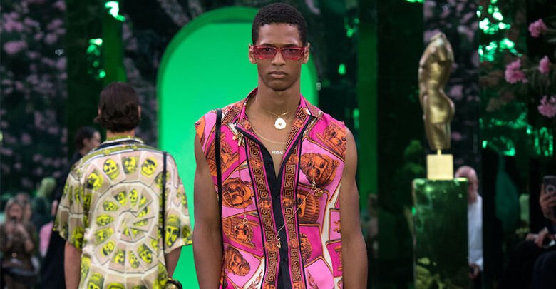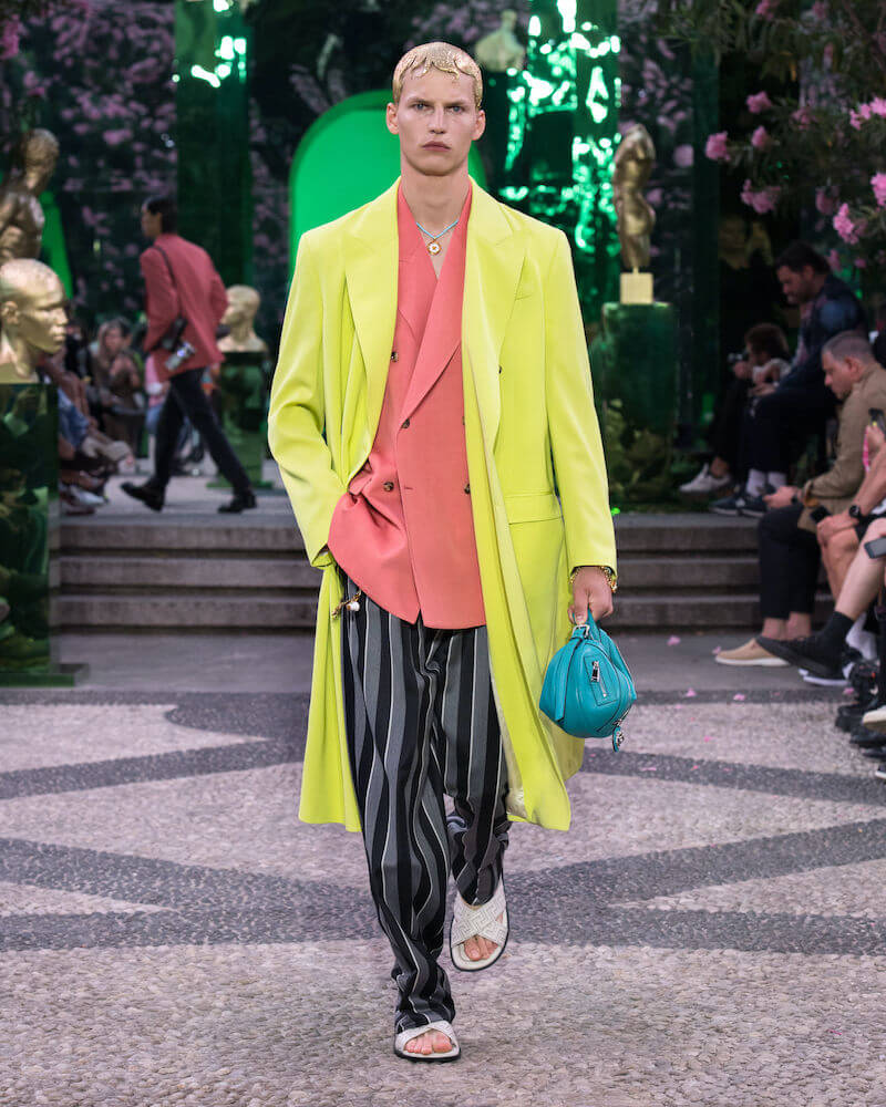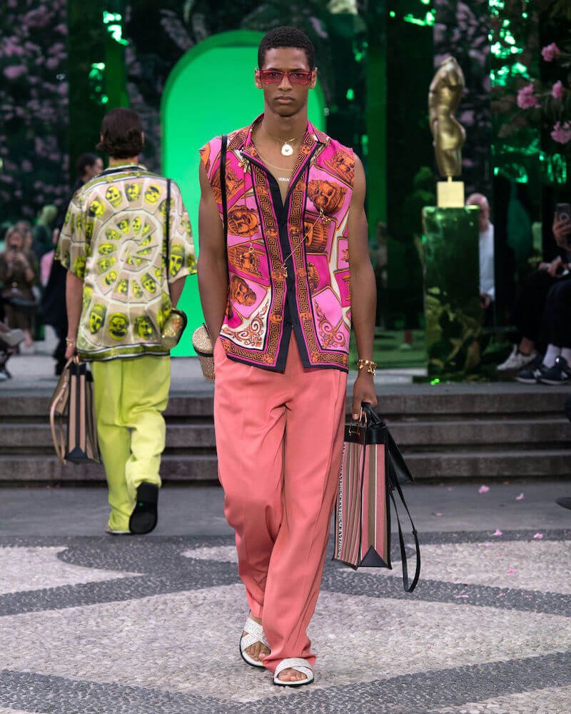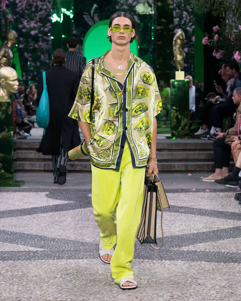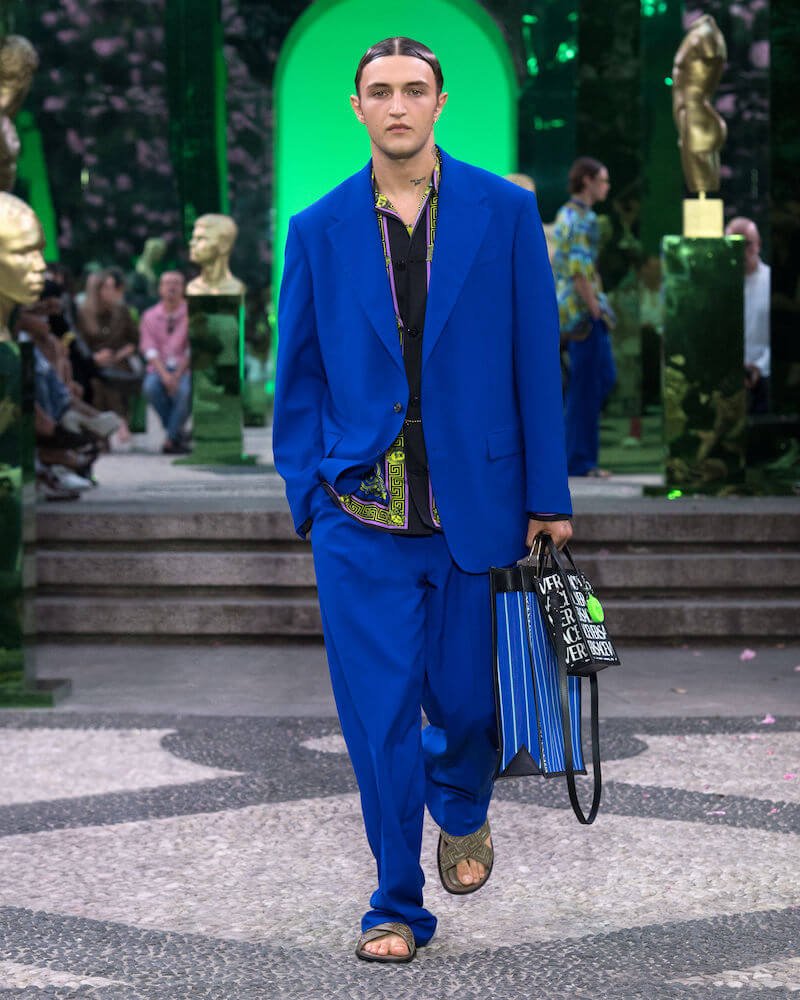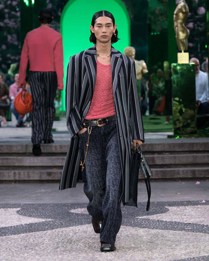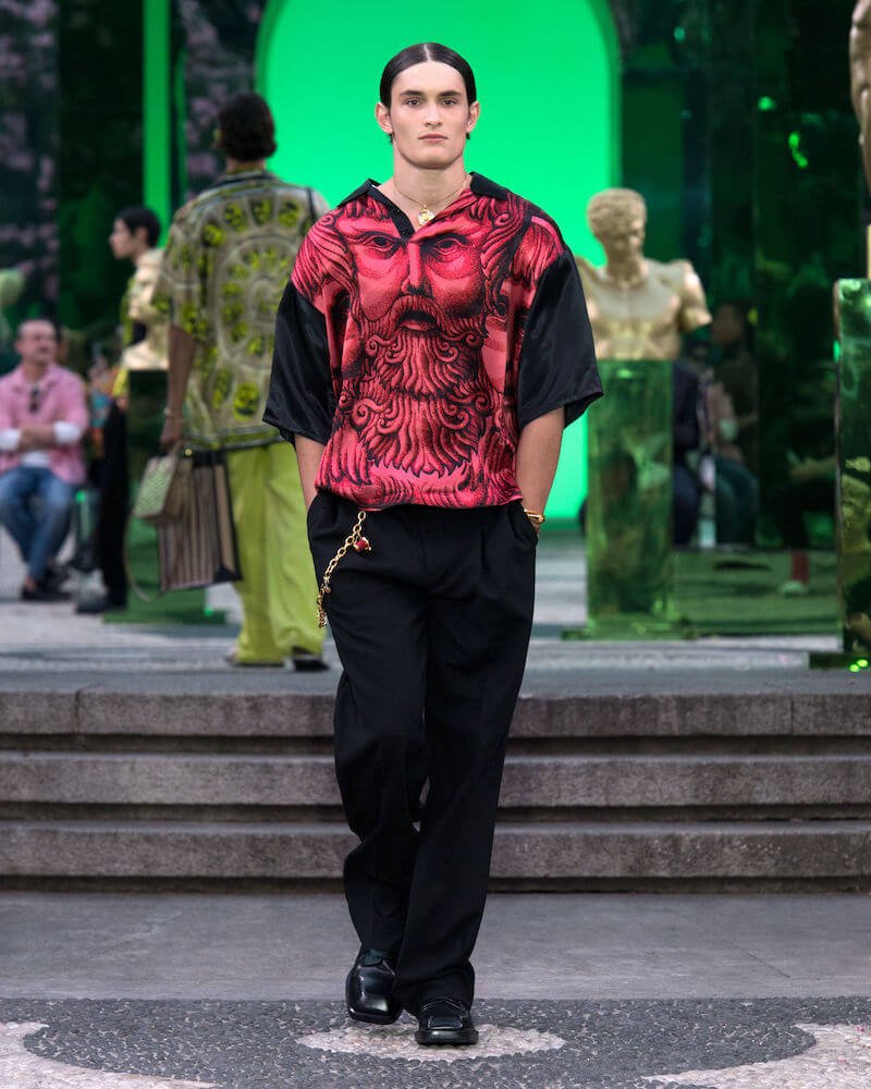 “When I work, I think of Generation Z and the freedom they have in not being afraid to mix contrasting pieces together,” said Donatella Versace in her shownotes. “Pop-art meets classicism—contrast like this is everything to me, it makes you think and feel.”