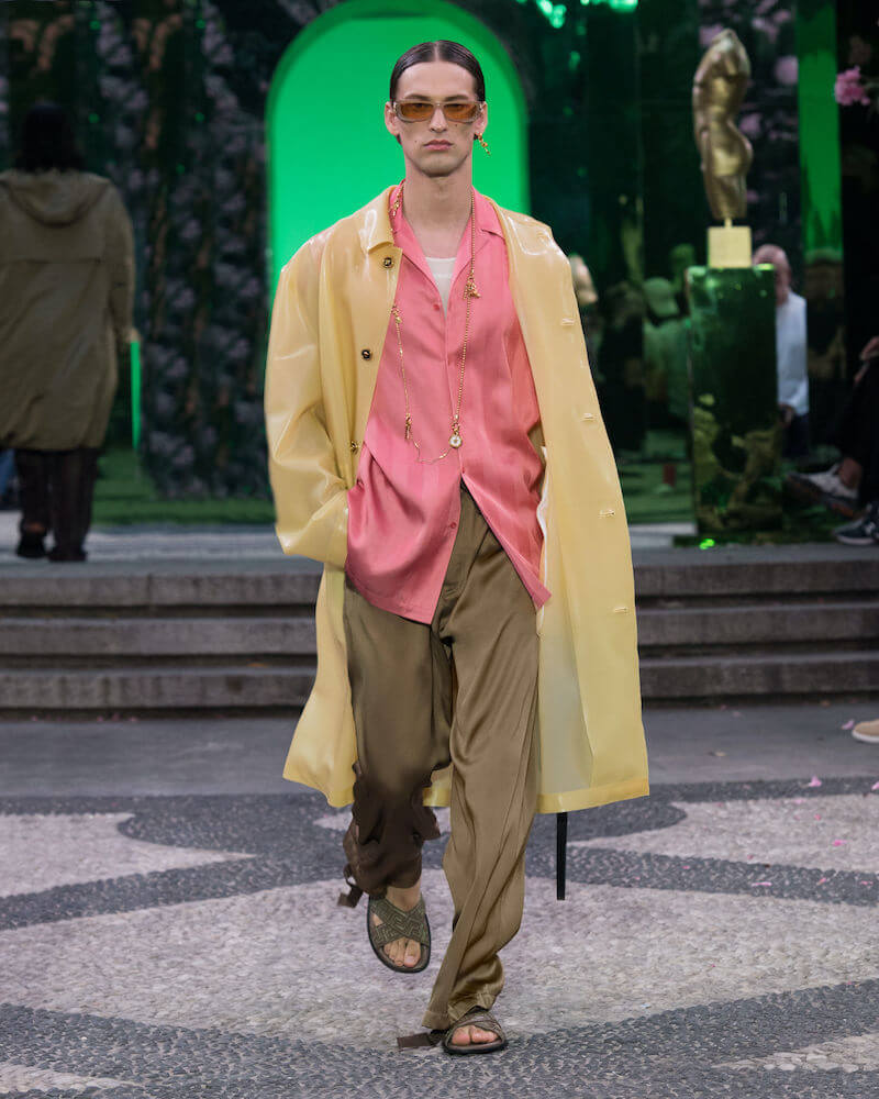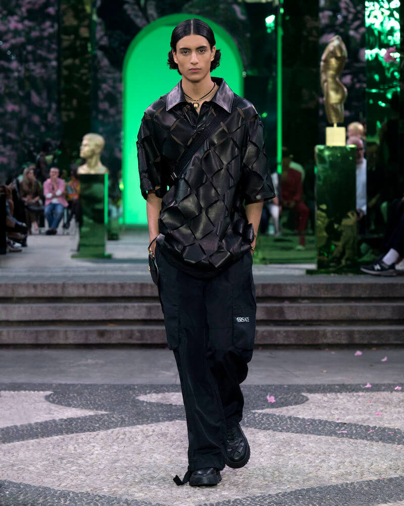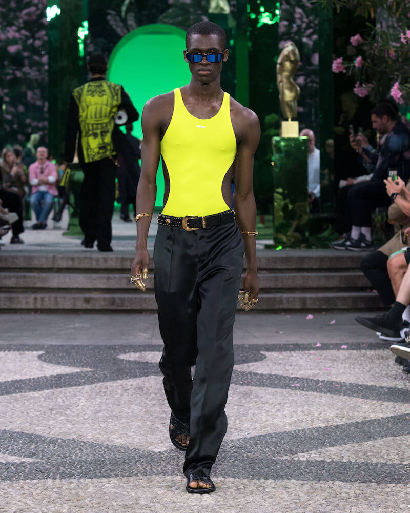 Relishing in off-kilter, oversized silhouettes, Versace sent her men, sporting statuesque gold-slicked hair, down the catwalk in skin-tight tops, diamond slashed pants, careful cutouts, racerback onesies, double layered tailoring and latex overcoats.