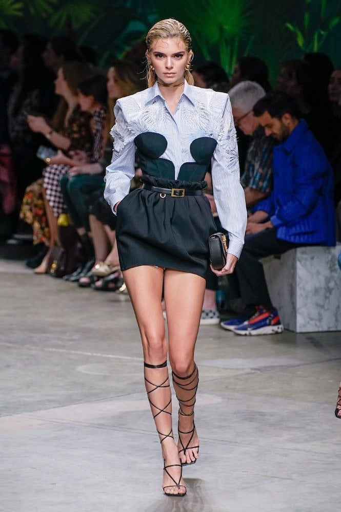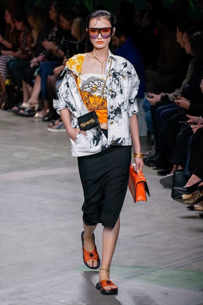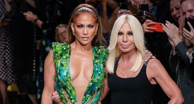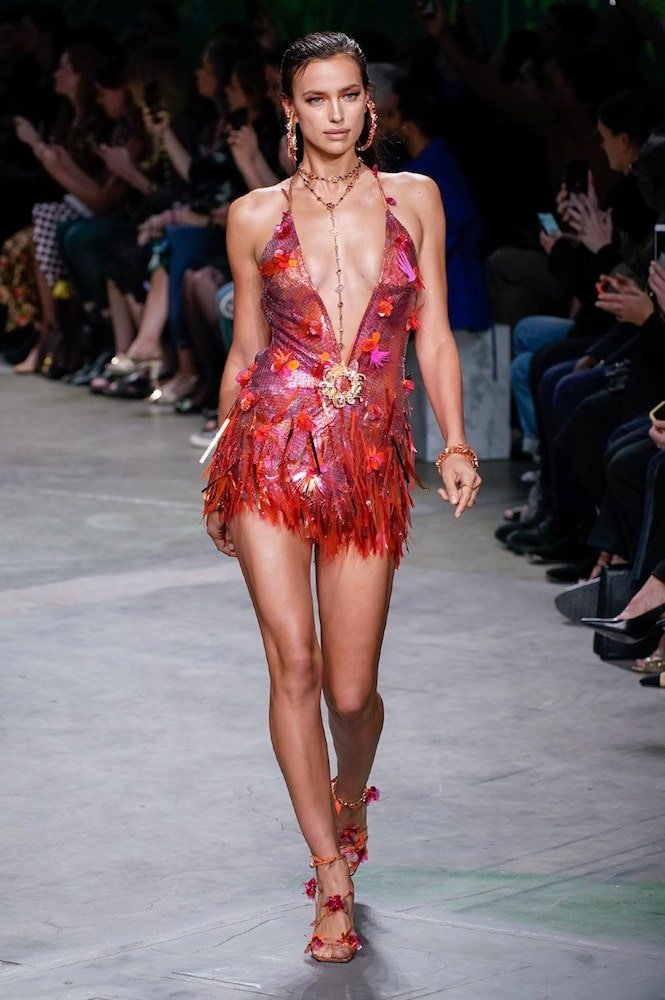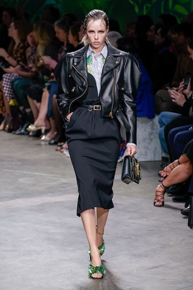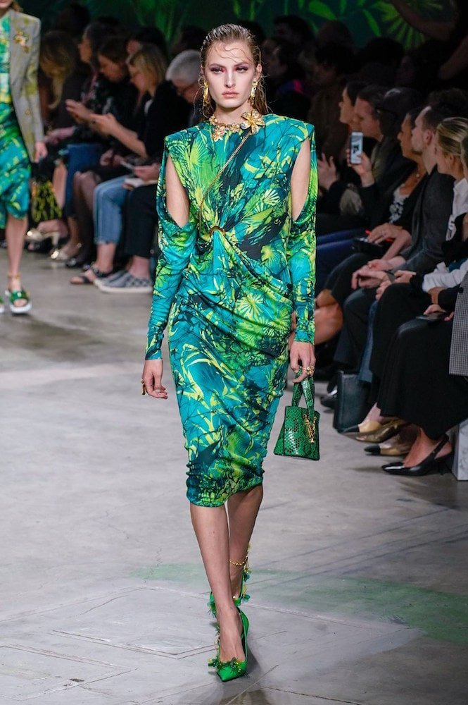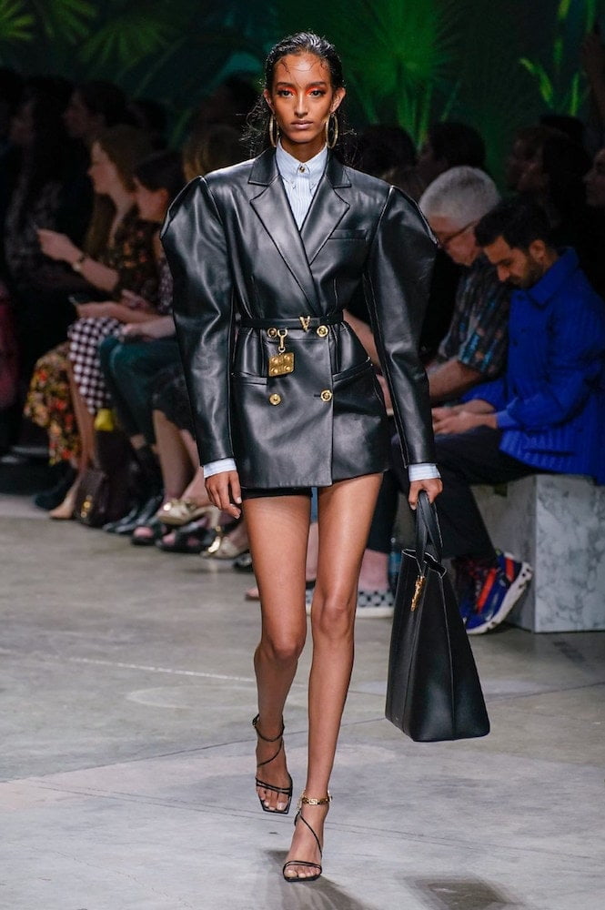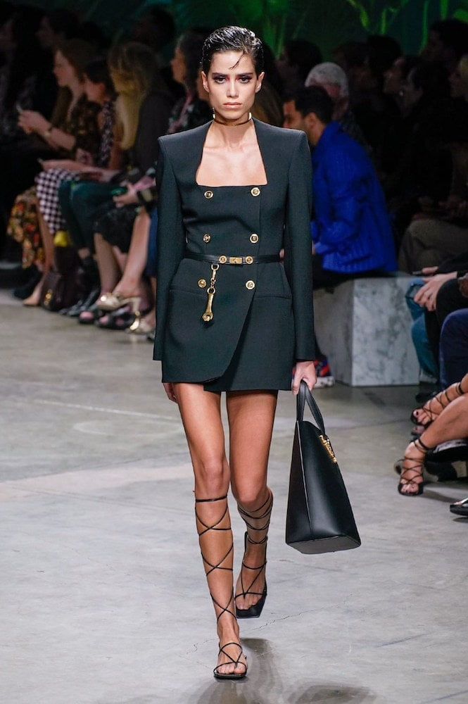 As pop culture moments go, JLo recreating her iconic Y2K Grammys appearance in a Versace Jungle dress has to rank near the top. Right after Amber Valetta showed off the final fashion show look, the walls of the vast circular venue lit up. “Ok Google show me images of the Versace Jungle dress,” said Donatella Versace’s voice. Immediately the walls of the venue were filled with scrolling images of JLo at the 2000 Grammys in the famous, plunging gown. “Now show me the real thing,” demanded Donatella. Enter JLo to hysterical screaming. The story goes that the idea for Google Image Search was born that Grammys night from the demand from users to see pictures of JLo in that dress. It’s just one example of the way Versace has woven itself into popular culture. The archive is rich with such gems. What’s interesting is how Donatella is using the past to speak to a new generation. Just as JLo’s dress was a version of the one she wore 20 years ago, not a direct copy, so Donatella’s SS20 collection riffed on Gianni Versace’s tight short tailoring of the early nineties.