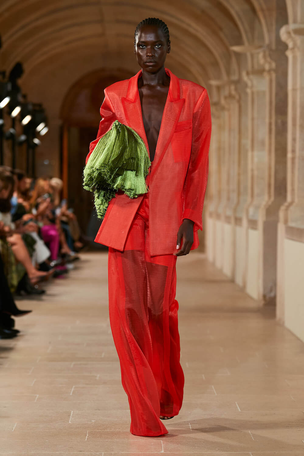 After three years away from the catwalk, Victoria Beckham admitted showing in Paris for the first time was a big moment for her. The designer was keen to show a new, more complex look. There were more bodycon shapes (she’s riding high off the launch of her VB body range). The collection erred towards the night, with lingerie slip dresses, designed to look as if they were falling off the body. Add knit body suits with swishy little tassel mini skirts, a plethora of sheer chiffon bias-cut dresses and leather jackets worn with nothing underneath and there was plenty of sass and sexuality.