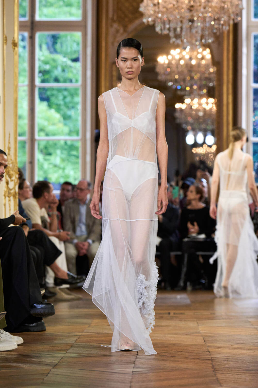 Staples of provincial English interiors – the embroidery of a tablecloth, the scalloped trim of a napkin, the Broderie Anglaise of a curtain – add a touch of comfort to pure white cotton dresses. The cushioning of a ballerina’s uniform is reflected in the circularly padded bustier of an Eau de Nil silk dress (also inspired by 1930s’ tea dresses).