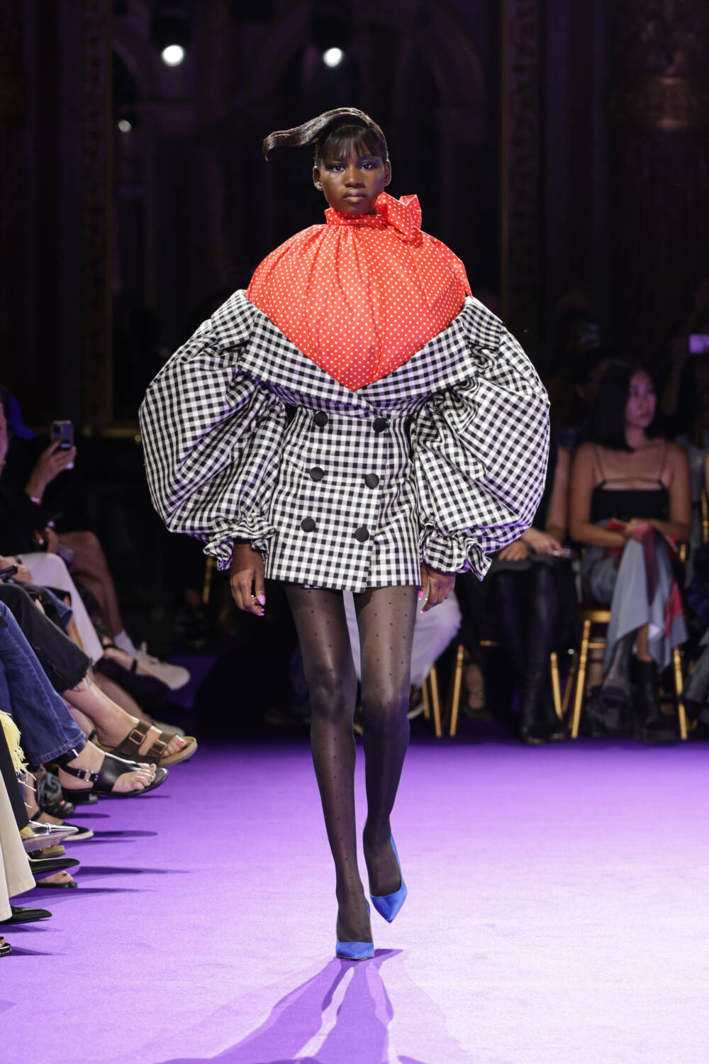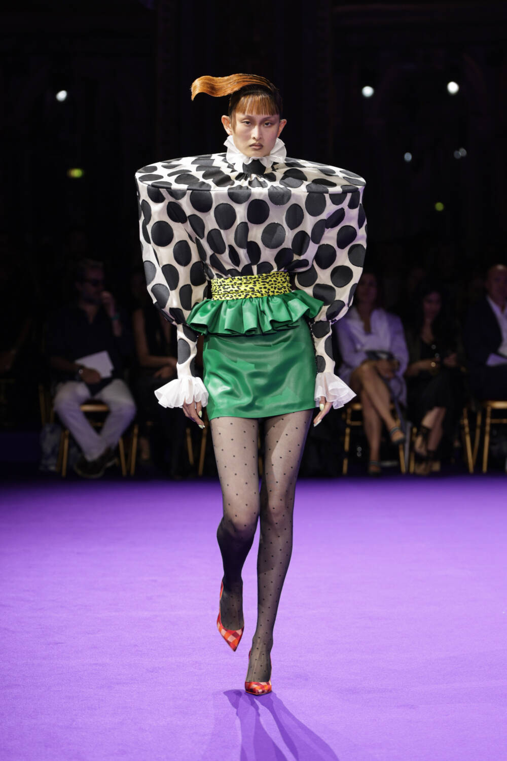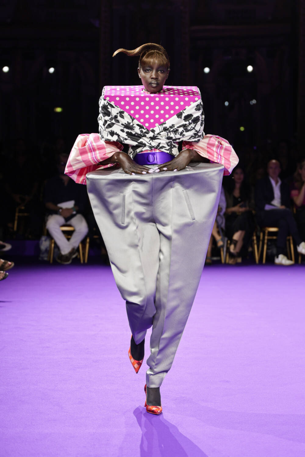 Born from the pair’s desire to articulate a “certain absurdism”, sculpture was the collection’s cornerstone. Jutting out from the hips in a very ‘tweedledee tweedledum’ kind of way, billowing trousers had structural, square waist bands or panniers and were rendered in graphic herringbone or lustrous solid hues. Using “building blocks drawn from the realms of constructivism and cubism, as well as from a child’s block set”, shoulders were sculpted into geometric triangles and spontaneous skirts became three-dimensional spheres worn over polka dot tights by Falke