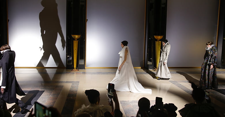 Was it Paris haute couture week or a trip to Transylvania? Viktor & Rolf’s latest couture outing takes its cues from the fatal allure of old Hollywood Dracula. “Dracula symbolised a fear of societal change, one that is prevalent again in today’s world,” read the show notes, with the duo explaining how the vampire’s sinister shadow came to define this season’s surreal shoulder construction.