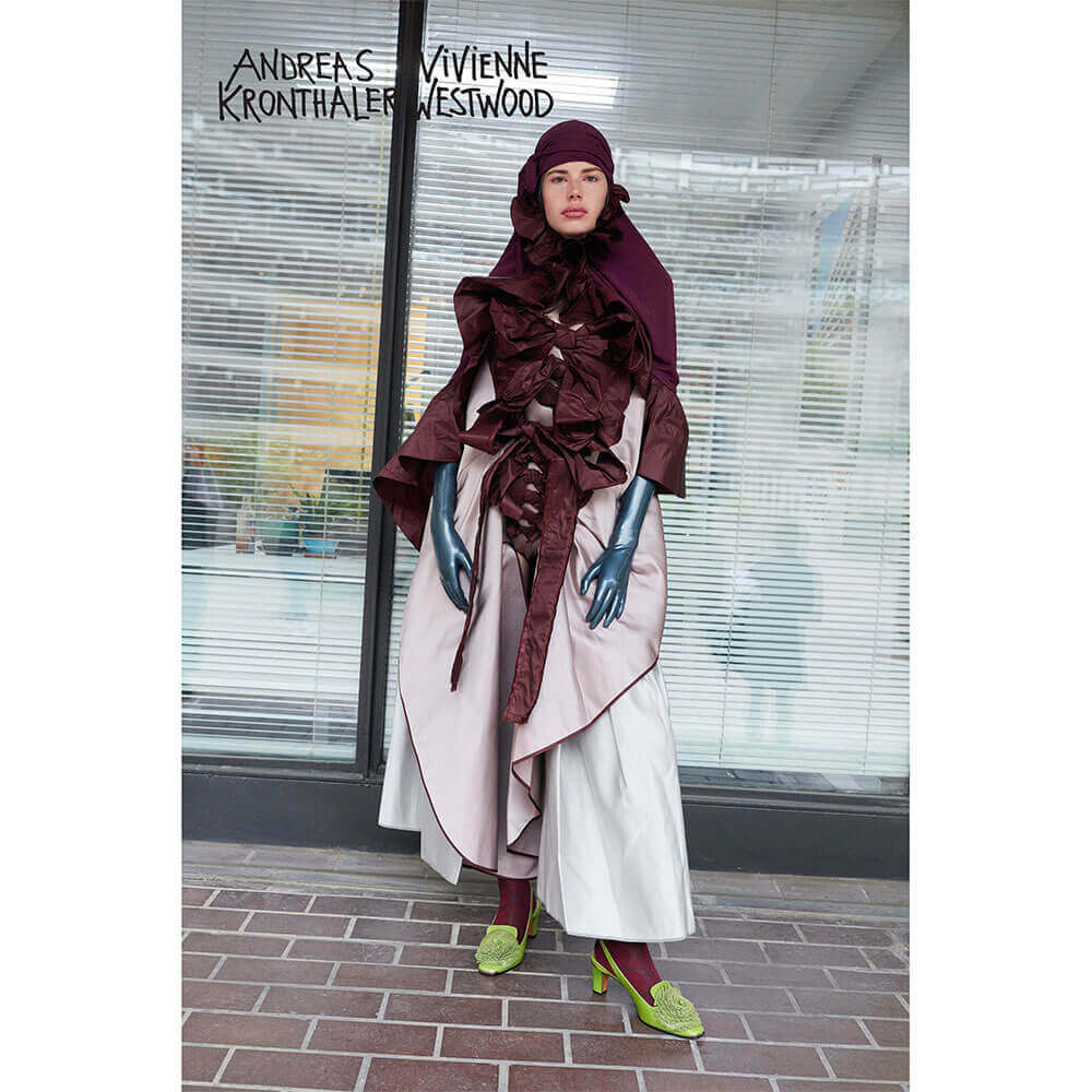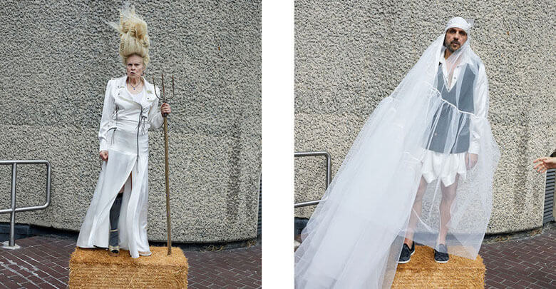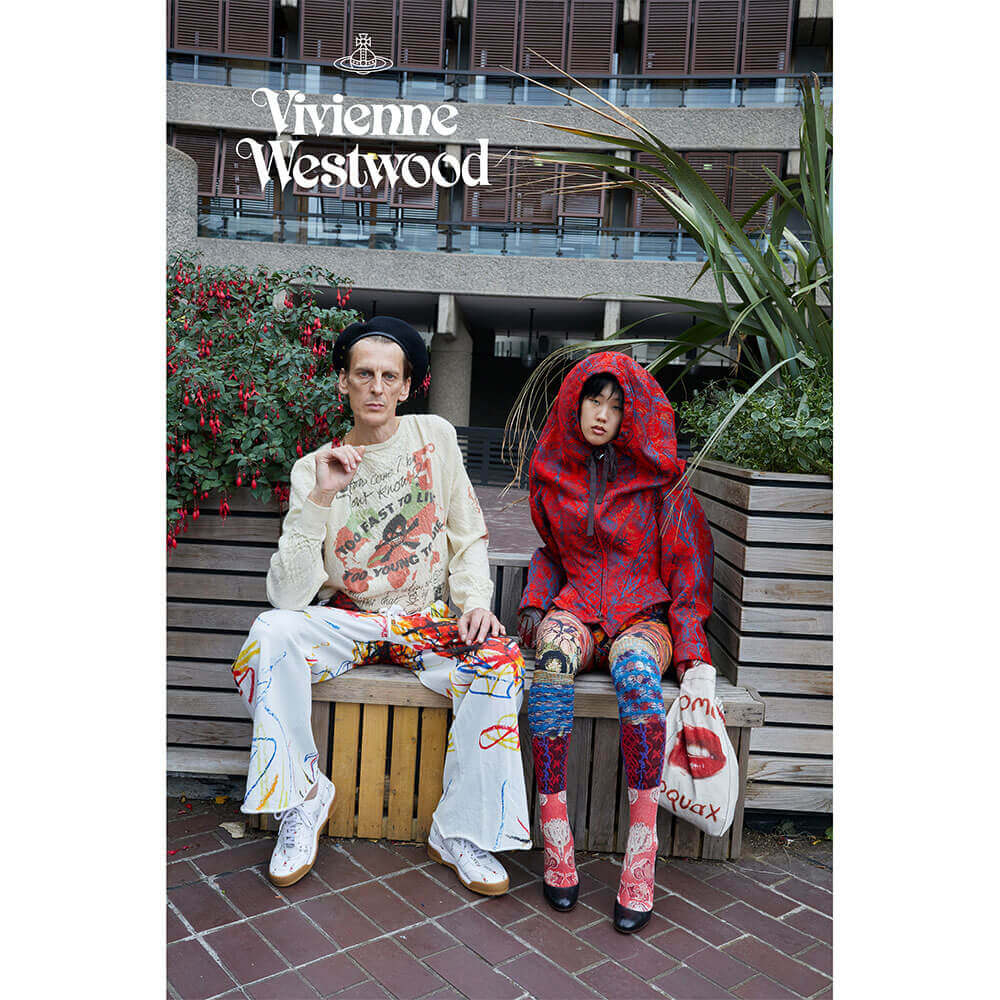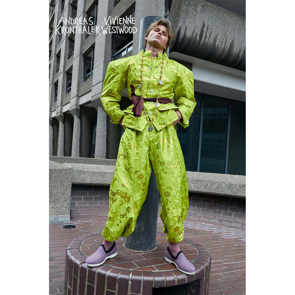Every Londoner loves a good trip to the Barbican every now and then. With its brutalist architecture and scenic water features, it makes the perfect location for an afternoon stroll with a loved one, a time-killer when you’ve got nothing to do with your mates or a perfect opportunity to spruce up your Instagram feed. Dame Viv and her partner Andreas Kronthaler are Barbican fanatics themselves, so much so the duo decided it would be the backdrop for their AW19 campaign. Their ongoing collaborator, Juergen Teller, made his way from the North Kensington studio and east-bound, bringing a stellar cast of models on the way. The campaign features the new super Duckie Thot in a morning workout routine, Andreas himself looking bridal in a floor-length veil and Dame Viv channeling Grant Wood’s American Gothic. A pitchfork firmly gripped in her hand, with a windswept beehive only she could pull off. “We love the Barbican, we go there on a regular basis over all these years, mostly to listen to concerts,” explains the pair. “It’s a place which always surprises you – the building is exciting, there’s always something new to discover.”