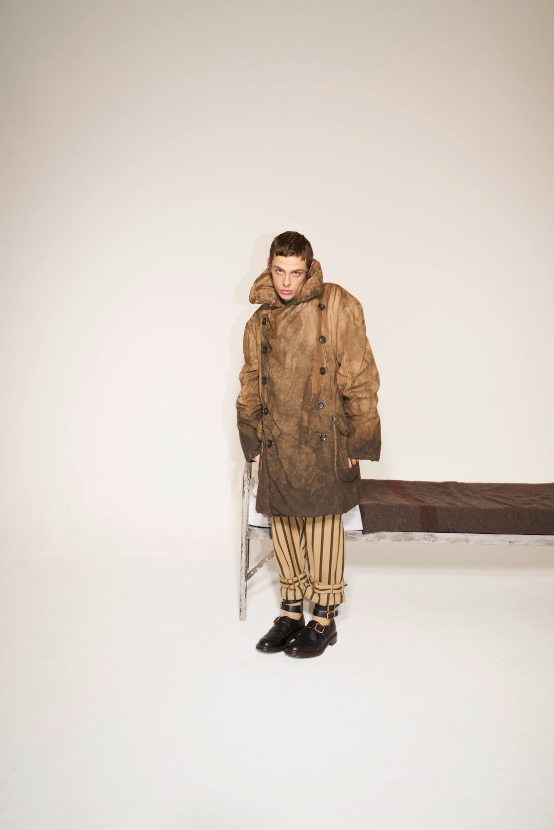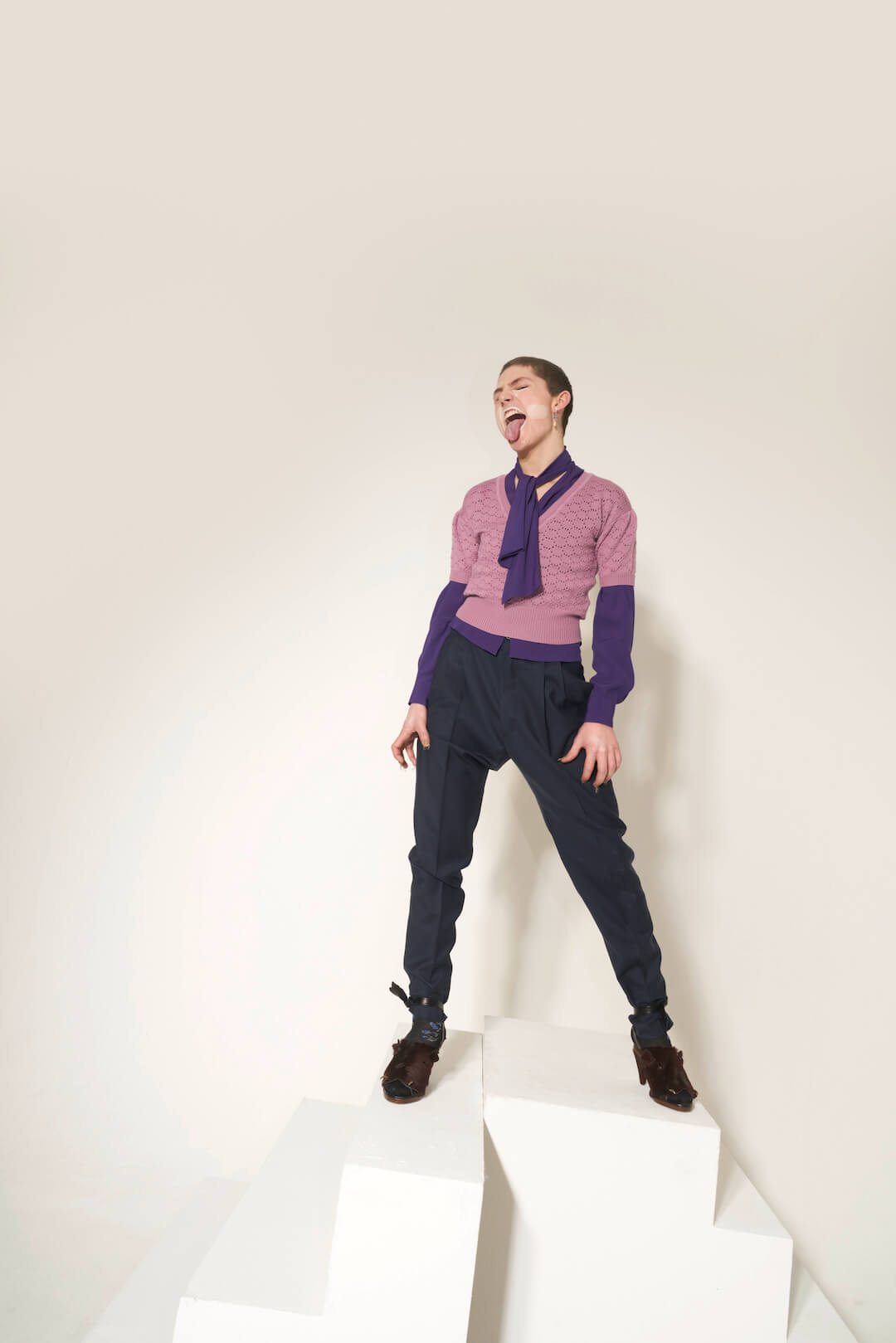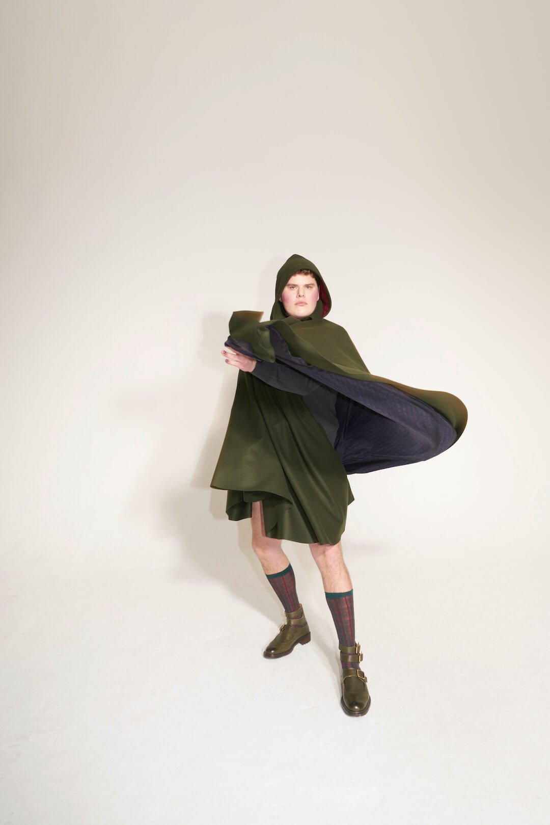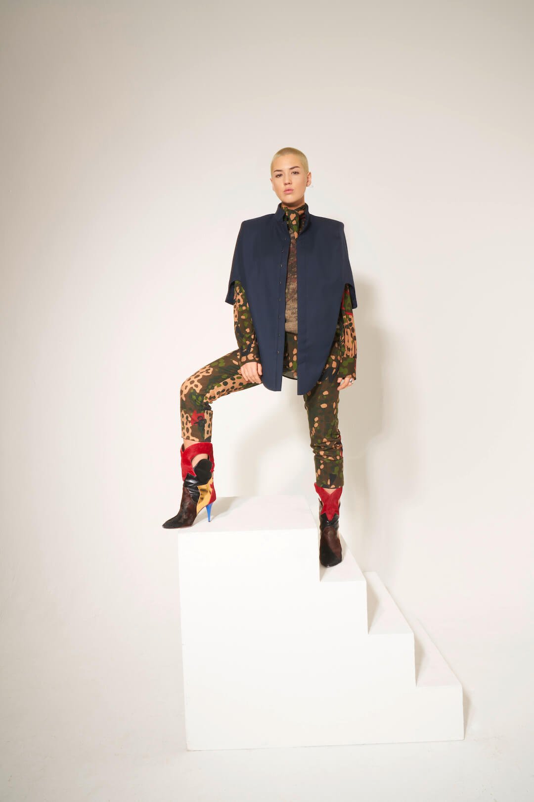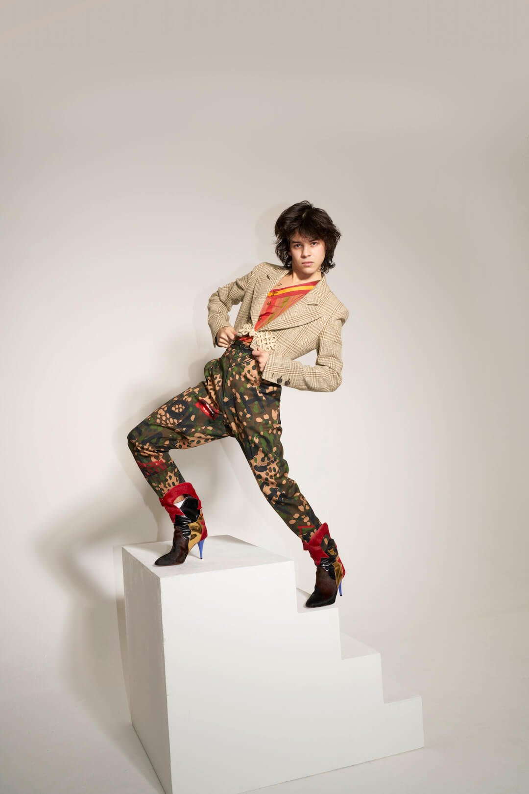 This collection was about the latter: war. She’s got to clubs, and that’s what those cards represent – the collection swirling around the phrase “sow the whirlwind, Reap the whirlwind,” from a “shield of terror” she designed for Warchild. So there are camouflage green meltons, bright red ones too, like old army uniforms, all mixed up with vivid camo in pink – based on Mountbatten pink, designed during World War II and capturing the move from mauve to grey at dusk. There is an old navy jacket, copied entirely from her legendary pirate collection (those pieces are still iconic, and we still want to wear them) whilst a Westwood favourite, the Princess coat, buttoning on the masculine side to make it unisex (“economical” says Vivienne) and made from Harris Tweed, the fabric long synonymous with her work.