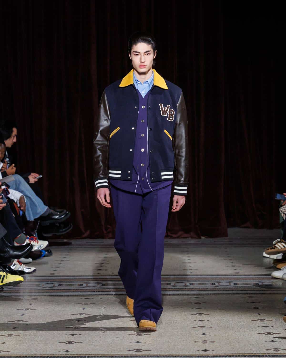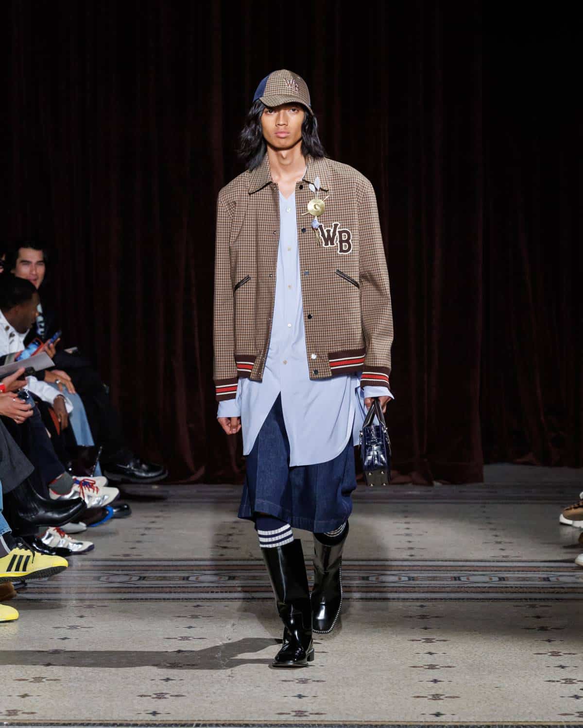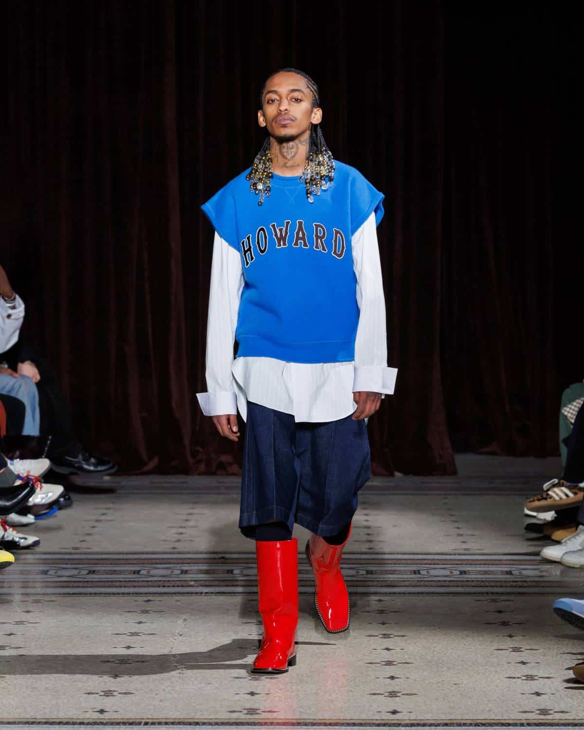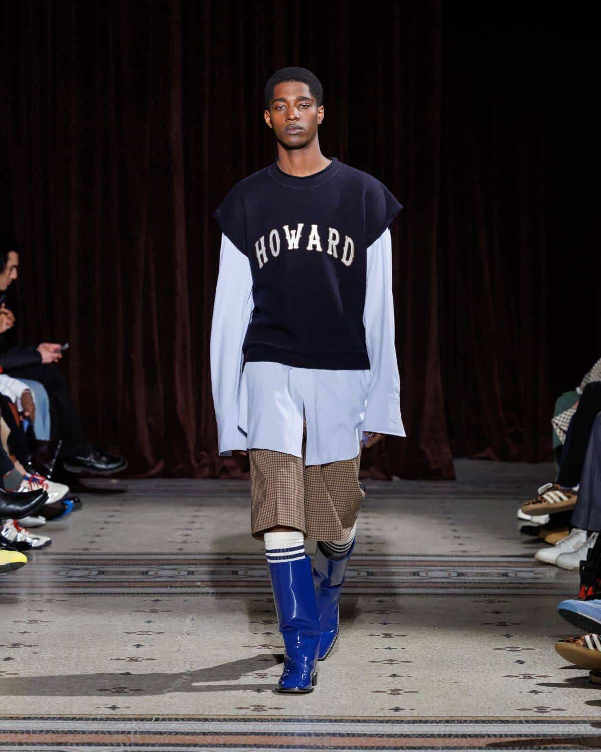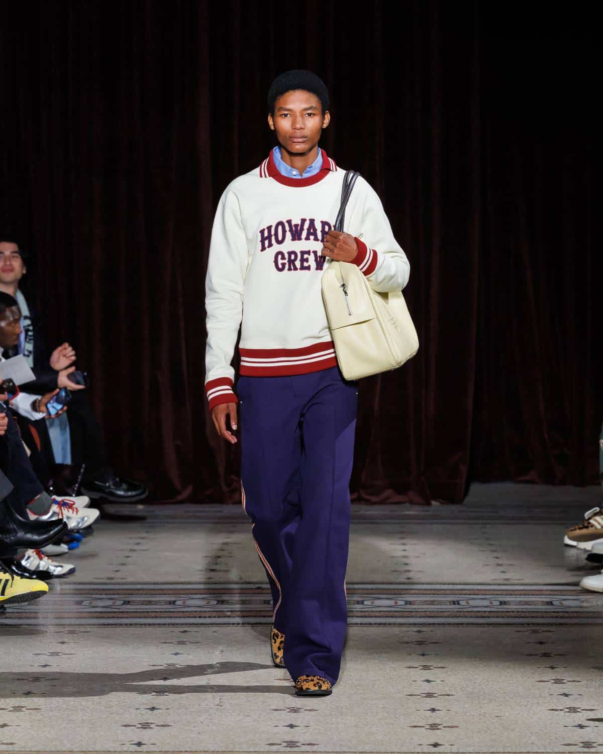Stepping to the hip-hop sample sounds of Rashad Ringo Smith and Yasiin Bey, out came an array of collegiate layering paired with slouchy trousers and midi skirts. In a lot of ways the collection was an original take on the MC style worn in those yearbooks: baggy quarter-zip jumpers, wool duffle coats and “Howard” logo crewnecks layered over collared shirts, underscored by silver-decked Timberland boots and a croc-embossed leather reprise of the Adidas Originals Superstar. It also paid homage to the prestigious sports legacy of the school through varsity blousons with ‘WB’ letter patches, satin baseball jerseys and sleeveless crew sweaters.