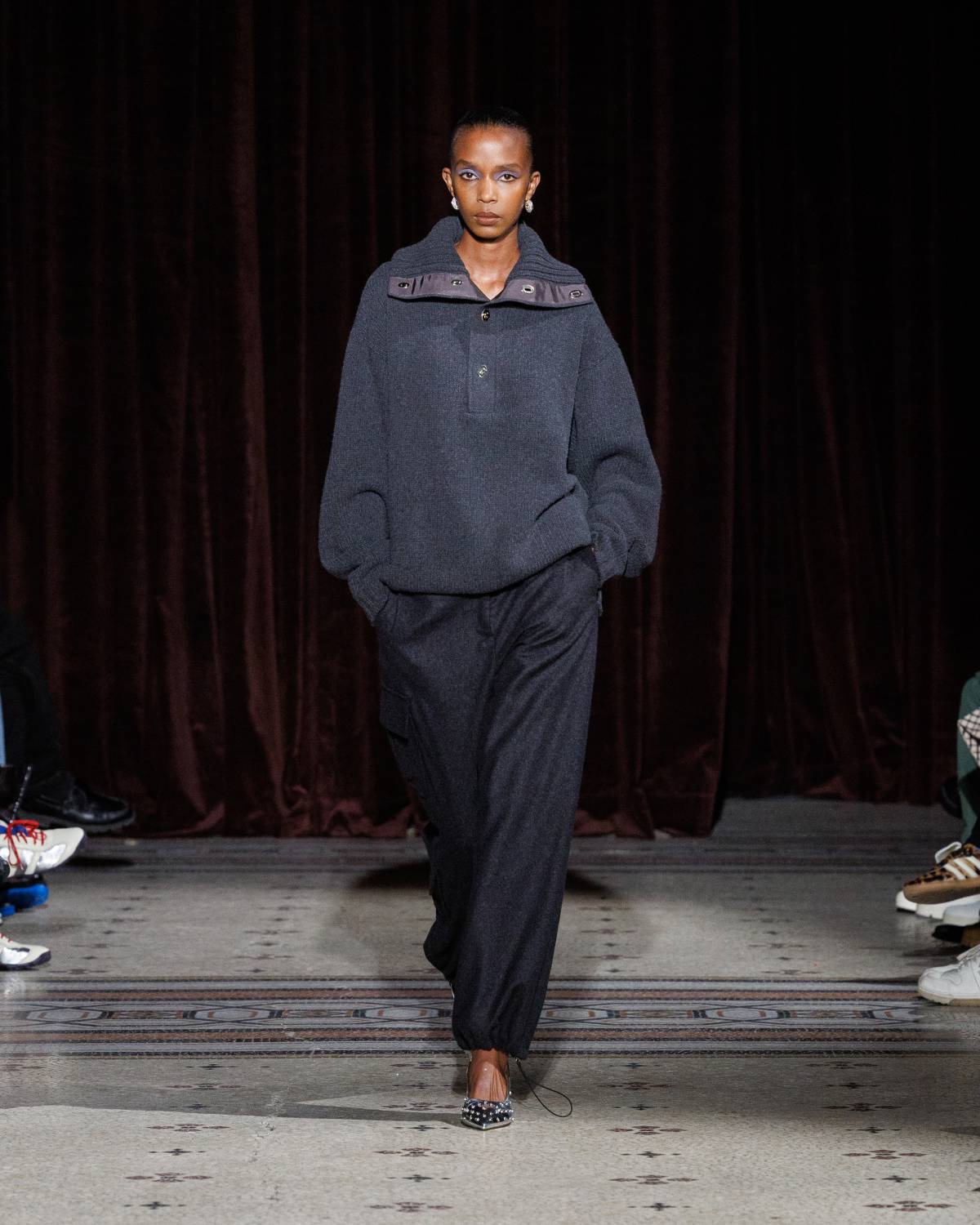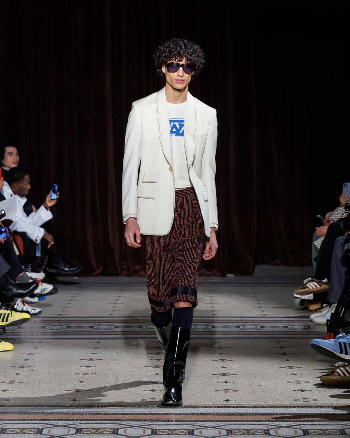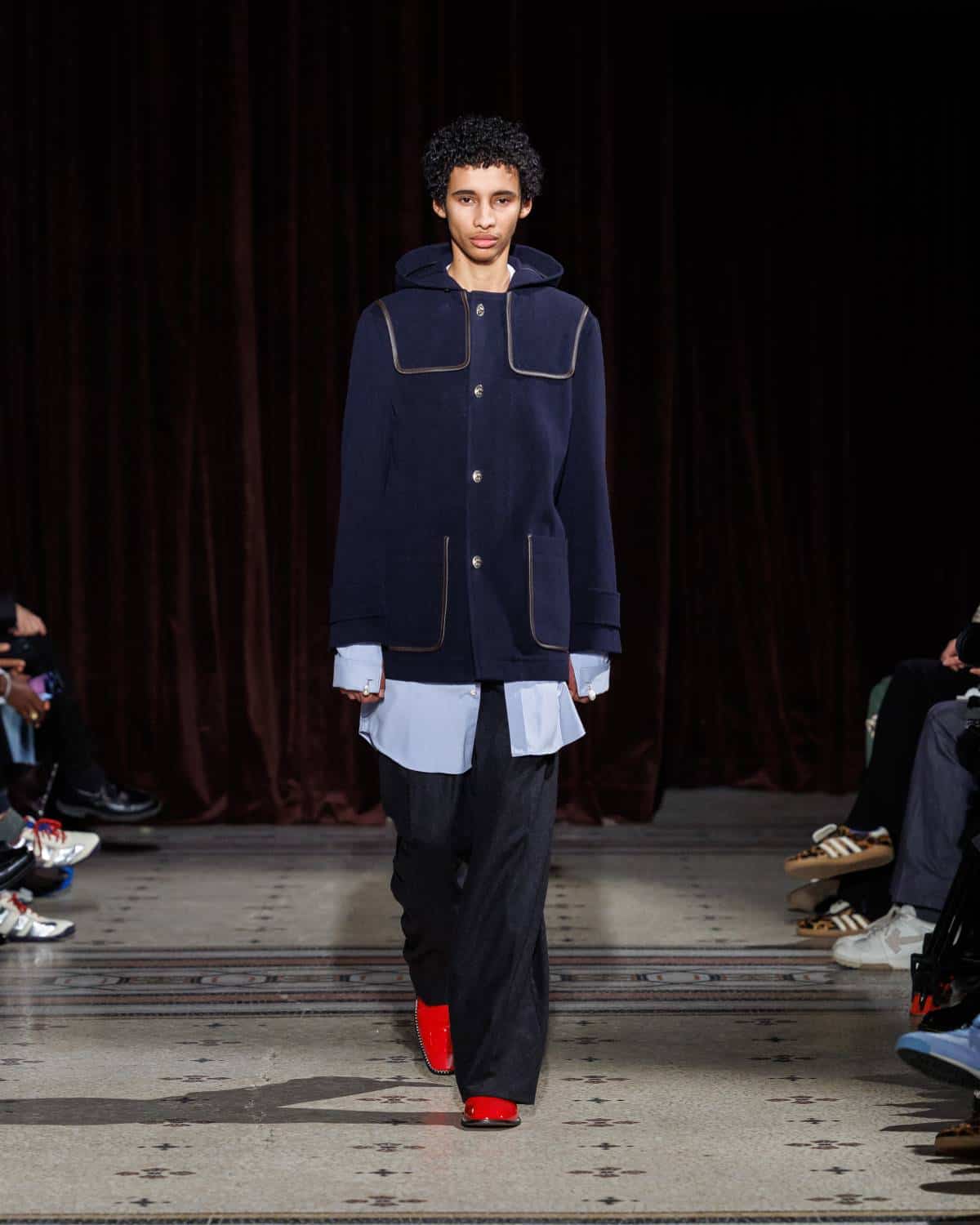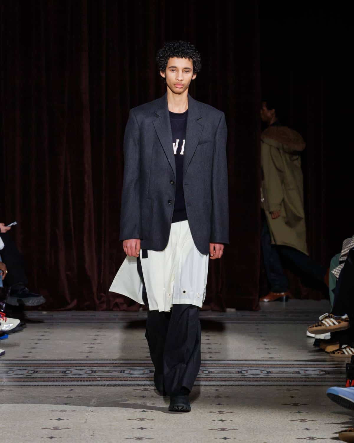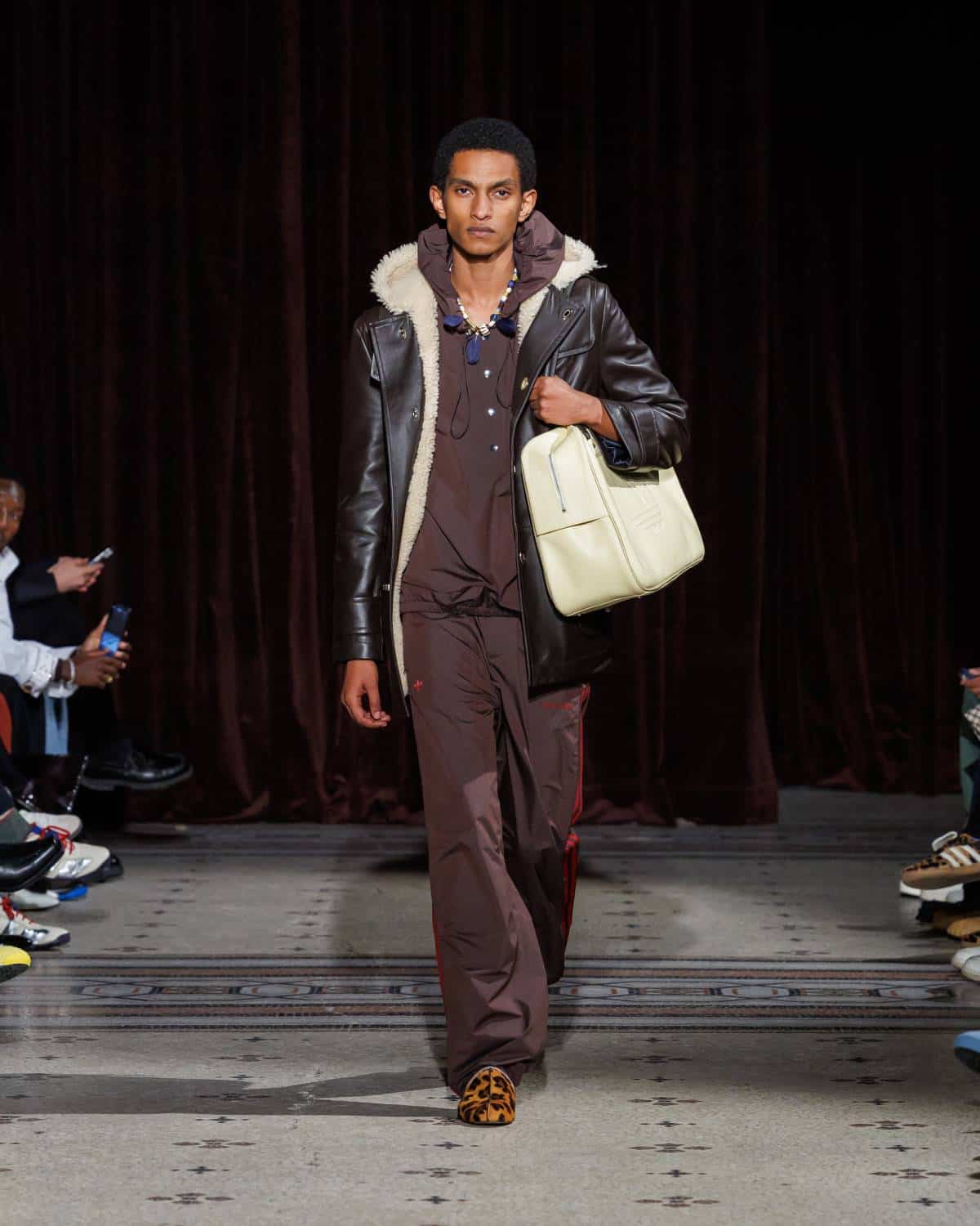 Stepping to the hip-hop sample sounds of Rashad Ringo Smith and Yasiin Bey, out came an array of collegiate layering paired with slouchy trousers and midi skirts. In a lot of ways the collection was an original take on the MC style worn in those yearbooks: baggy quarter-zip jumpers, wool duffle coats and “Howard” logo crewnecks layered over collared shirts, underscored by silver-decked Timberland boots and a croc-embossed leather reprise of the Adidas Originals Superstar. It also paid homage to the prestigious sports legacy of the school through varsity blousons with ‘WB’ letter patches, satin baseball jerseys and sleeveless crew sweaters.
