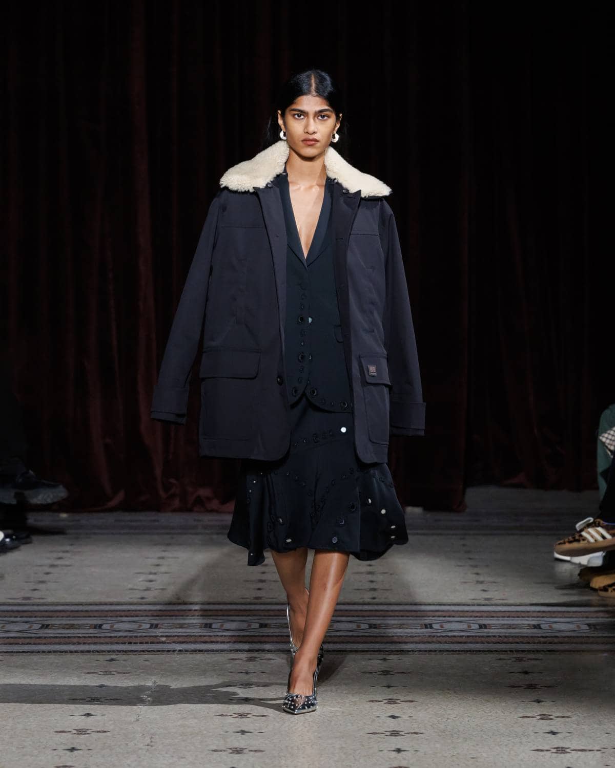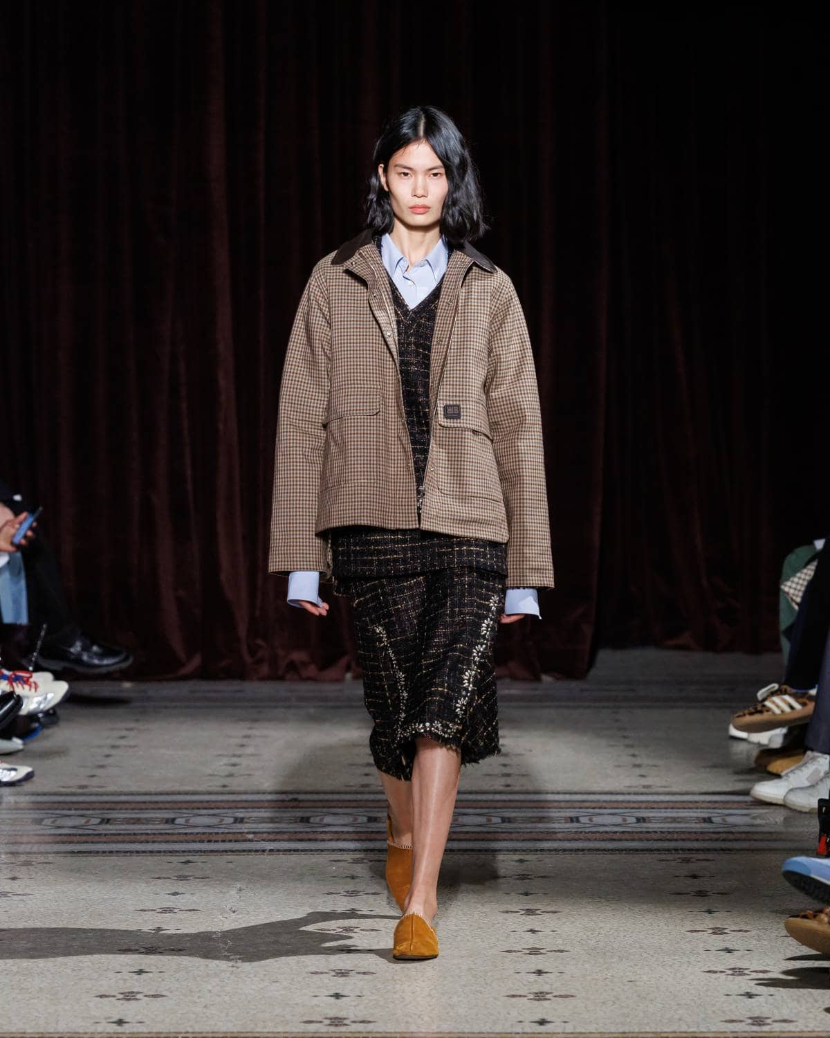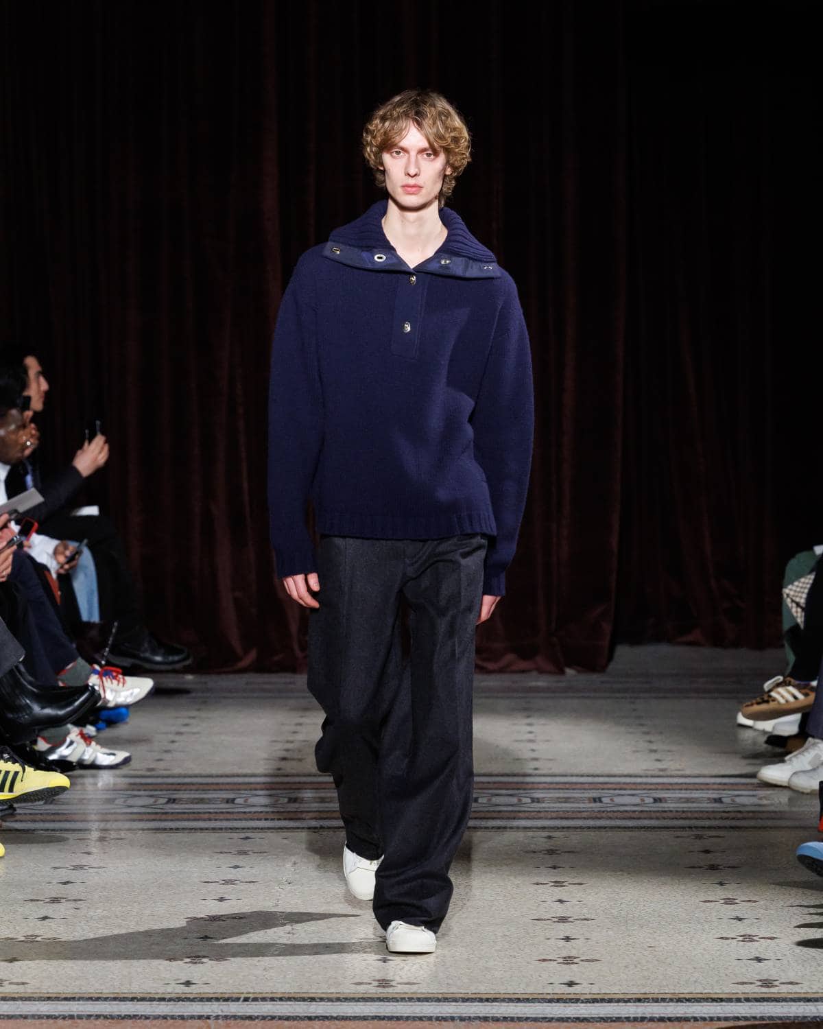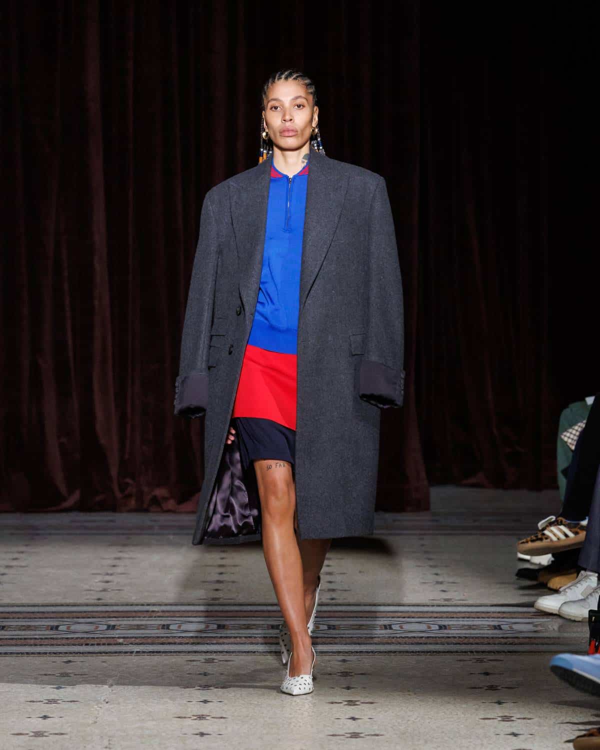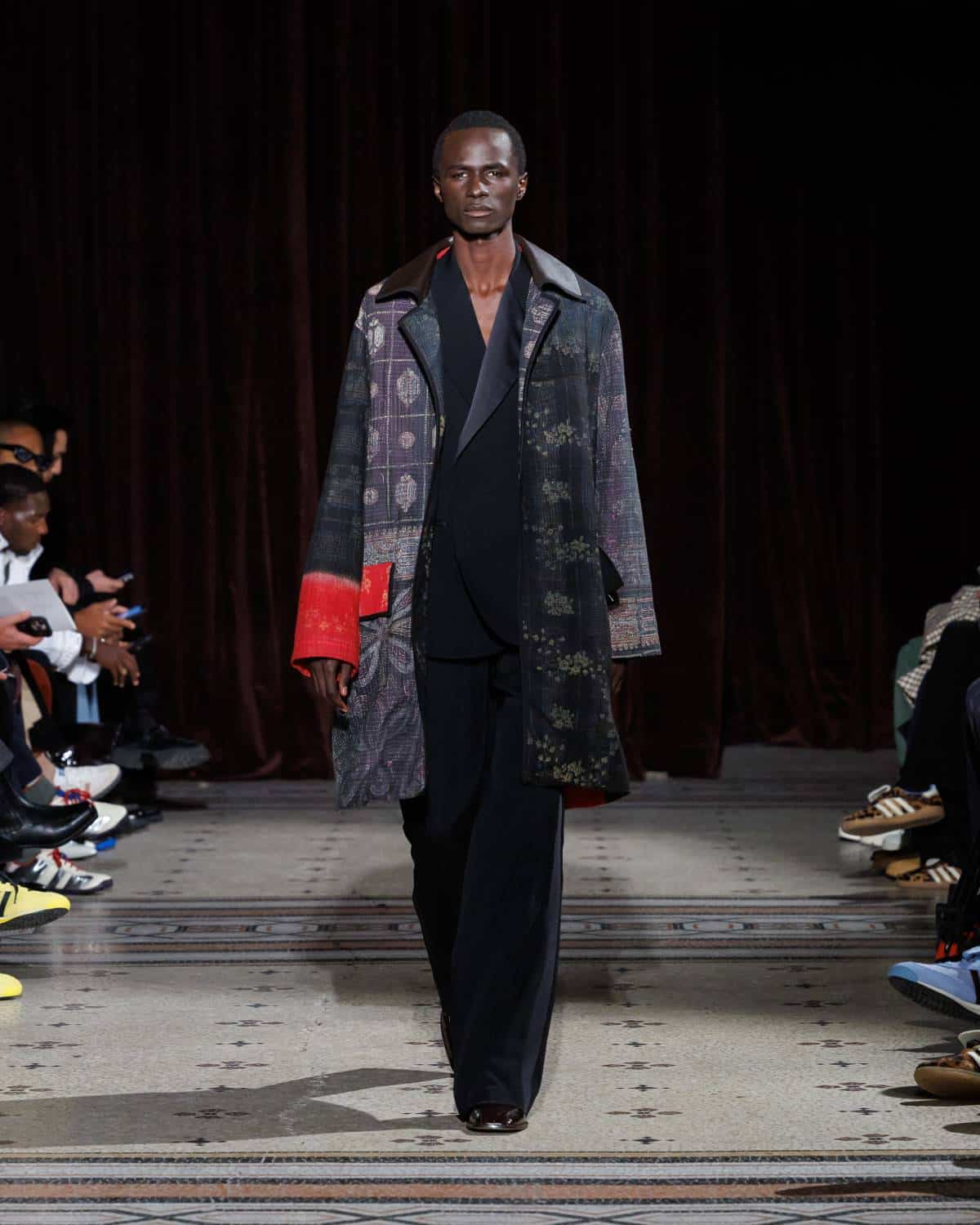 Stepping to the hip-hop sample sounds of Rashad Ringo Smith and Yasiin Bey, out came an array of collegiate layering paired with slouchy trousers and midi skirts. In a lot of ways the collection was an original take on the MC style worn in those yearbooks: baggy quarter-zip jumpers, wool duffle coats and “Howard” logo crewnecks layered over collared shirts, underscored by silver-decked Timberland boots and a croc-embossed leather reprise of the Adidas Originals Superstar. It also paid homage to the prestigious sports legacy of the school through varsity blousons with ‘WB’ letter patches, satin baseball jerseys and sleeveless crew sweaters.