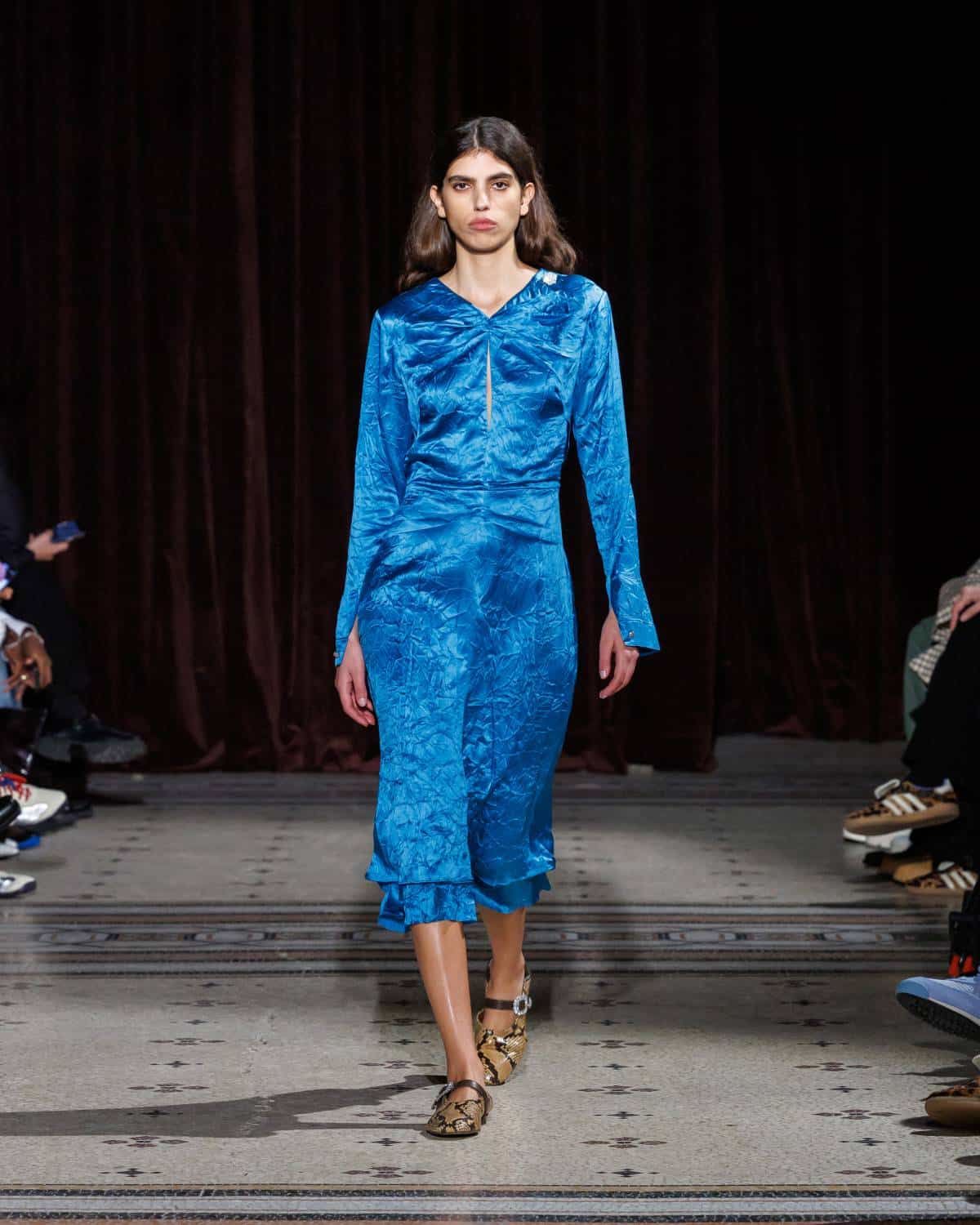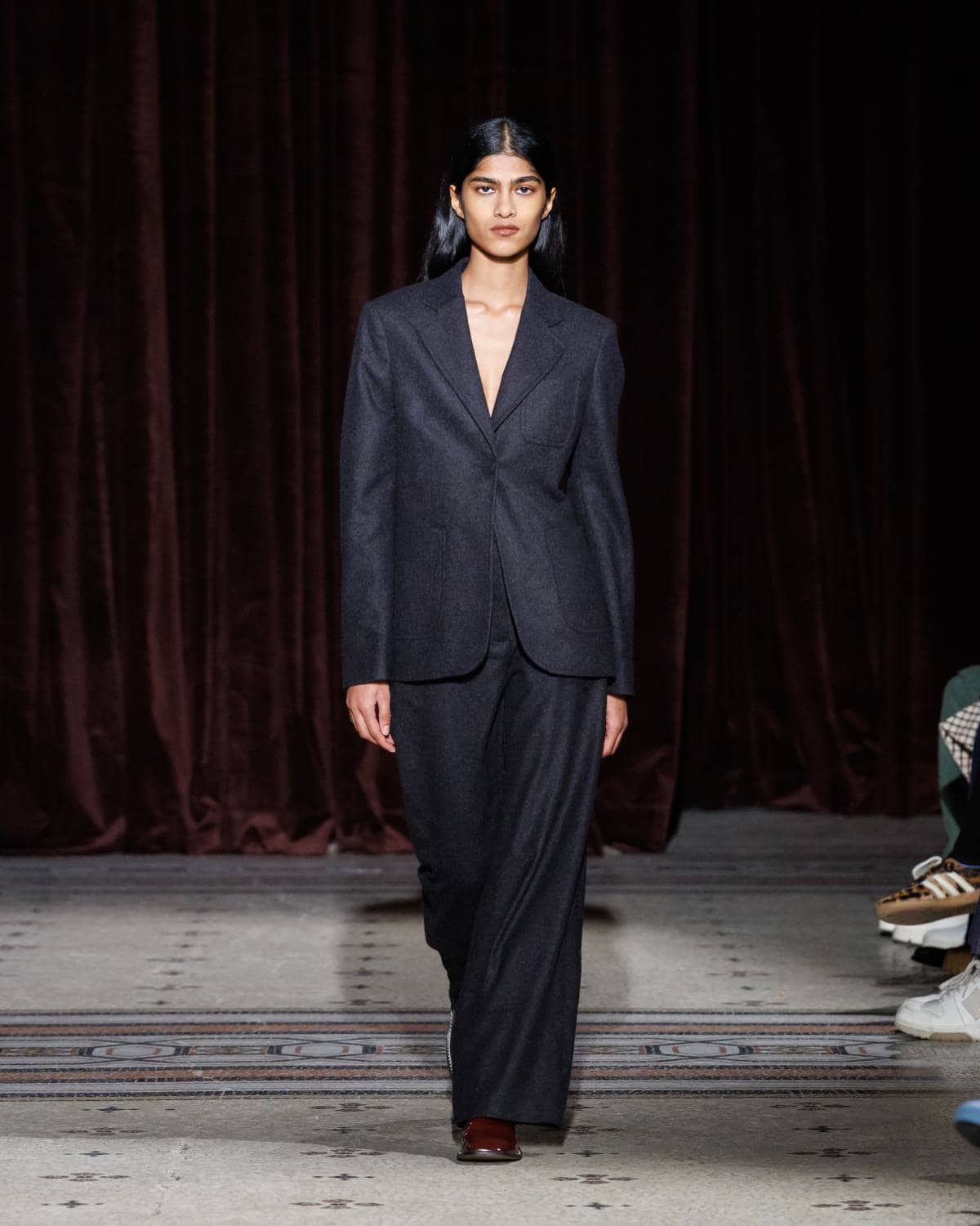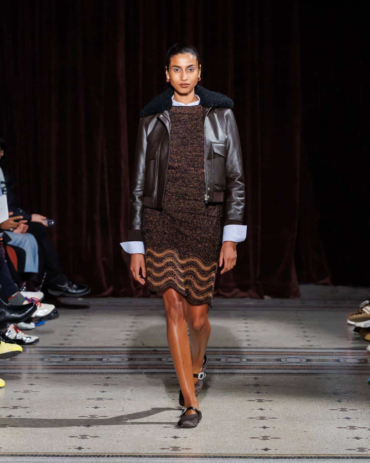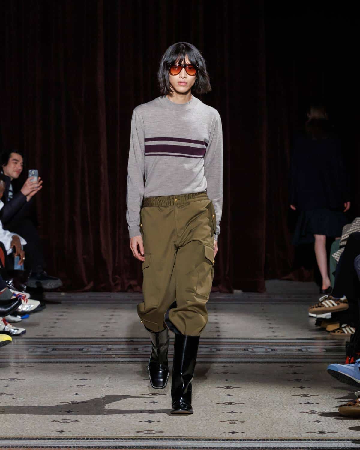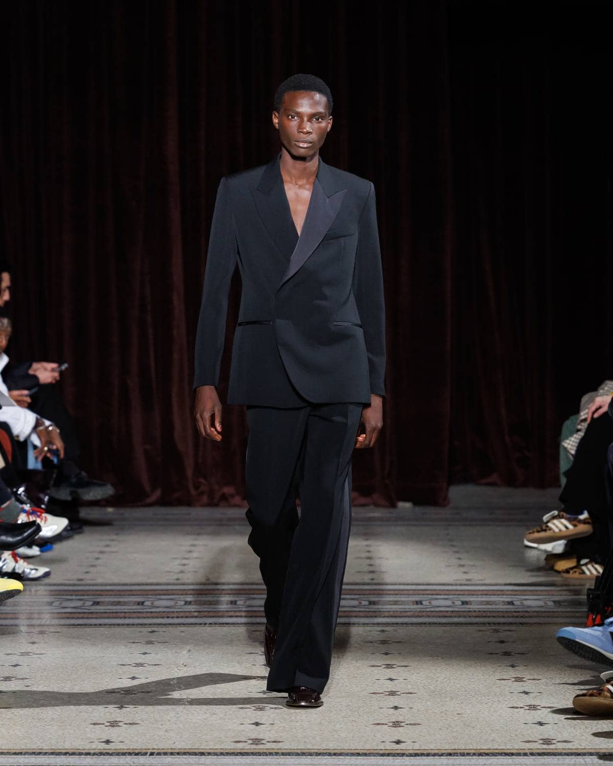 Stepping to the hip-hop sample sounds of Rashad Ringo Smith and Yasiin Bey, out came an array of collegiate layering paired with slouchy trousers and midi skirts. In a lot of ways the collection was an original take on the MC style worn in those yearbooks: baggy quarter-zip jumpers, wool duffle coats and “Howard” logo crewnecks layered over collared shirts, underscored by silver-decked Timberland boots and a croc-embossed leather reprise of the Adidas Originals Superstar. It also paid homage to the prestigious sports legacy of the school through varsity blousons with ‘WB’ letter patches, satin baseball jerseys and sleeveless crew sweaters.