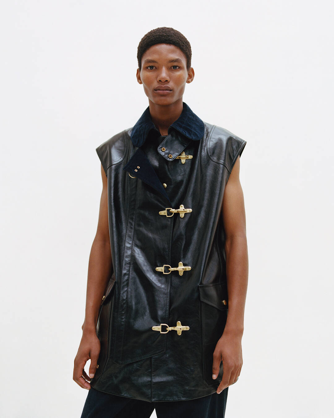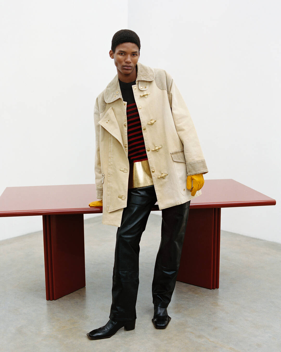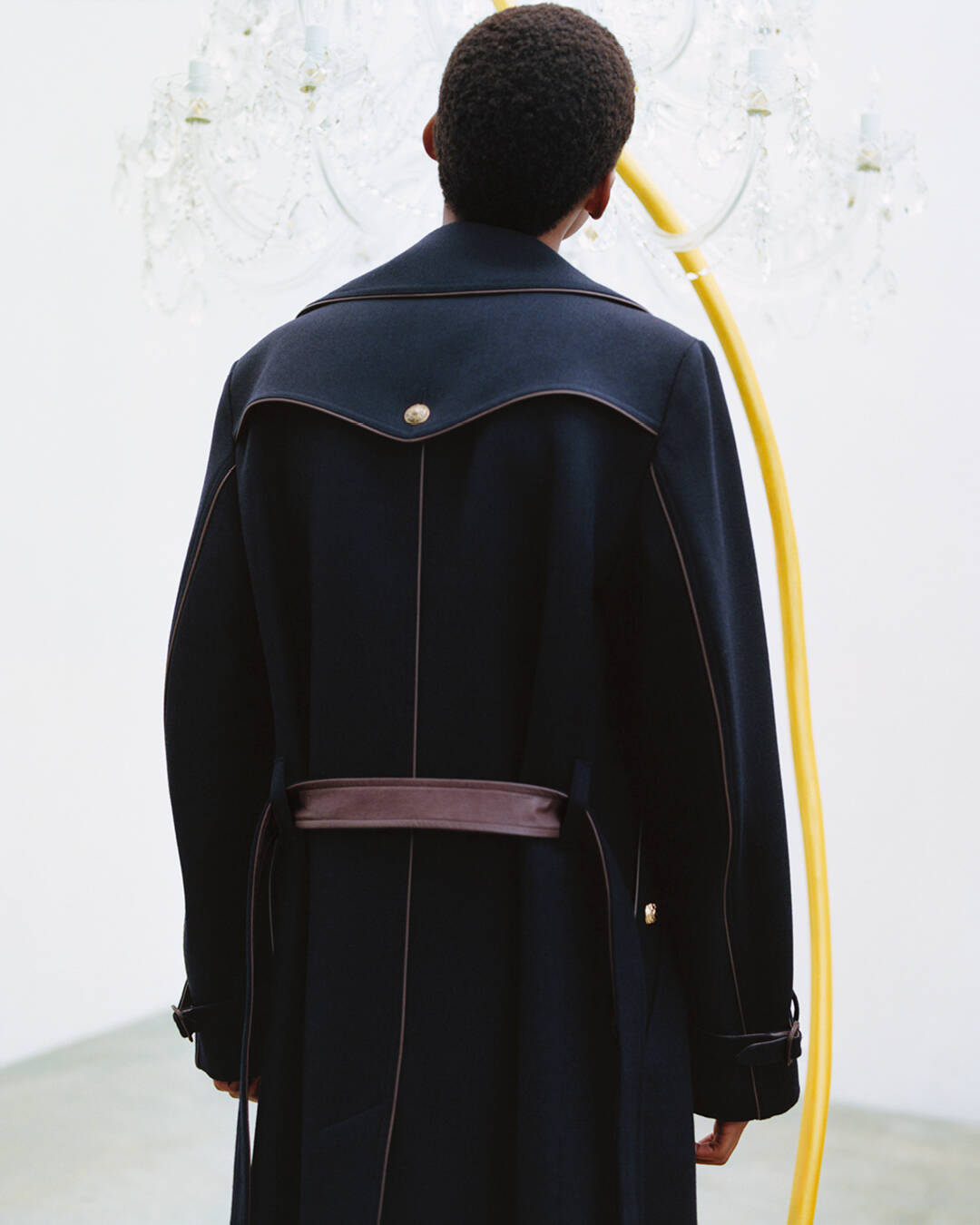 Elsewhere, a partnership with Savile Row tailors Anderson & Sheppard results in a reworked cavalry uniform featuring embossed gold buttons and satin contrasts, bringing military precision into Wales Bonner’s elevated world of modern tailoring. A cross-pollination with heritage English makers Crombie Ltd., on the other hand, brings to life a classic grate coat crafted from navy wool with leather finishings.
