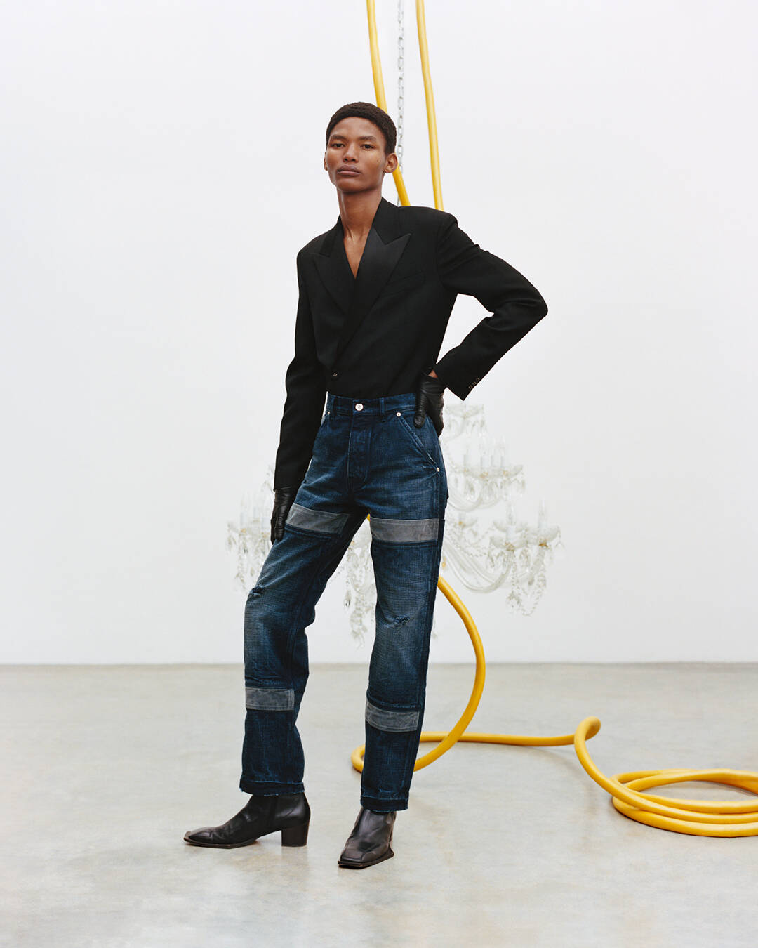 Included in the collection is a standout link-up with Chicago and Japan-based artist Theaster Gates’ whose decade-long, ongoing conceptual project, The Black Image Corporation, aims to preserve and reactivate the archives of the Johnson Publishing Company. In line with this, the collection incorporates archival images photographed by Moneta Sleet Jr. and Isaac Sutton and taken from the now defunct Ebony and Jet magazines – specifically those that honour the Black woman’s role in shaping culture globally – which Bonner translates into rich indigo jacquards and cobalt blue prints. It’s a celebration of Black cultural history, seamlessly woven into Wales Bonner’s signature silhouettes.