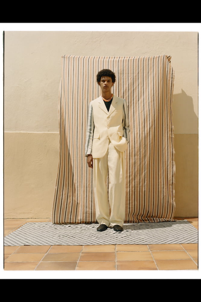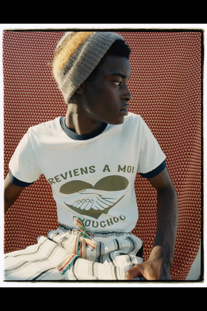 Accompanying the collection with a Spotify playlist of 1970s/80s Burkinabe music, the rich soundscapes seep directly into the clothes. Wales Bonner lifts Japanese-inspired floral prints – inspired by a piece worn by one of Sory’s subjects – and pairs them alongside hallmarks of her namesake label, which includes lightweight tailoring with linen-striped sleeves and generously sized cargo trousers. This season sees the designer work with hand-woven Burkina Faso cotton, as well as West African jacquard, pairing gentle mohair knits and hybradised denim alongside airy summer dresses.