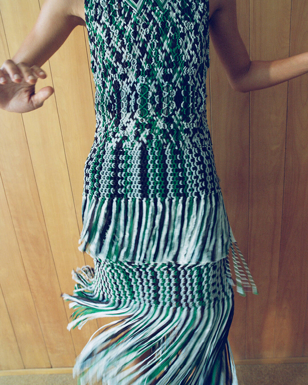 Craft runs deep, materialising in natural indigo and textural corduroy contrasts. Macramé sets handwoven in India sit alongside silk and organza, where chrome stud embellishments transform into fine embroidery. The finishing touch? Gold-studded pilgrim loafers, leather boots and the Jewel Mary Jane, reissued in gold. This is a designer who understands glamour – not with excess, but with intention.