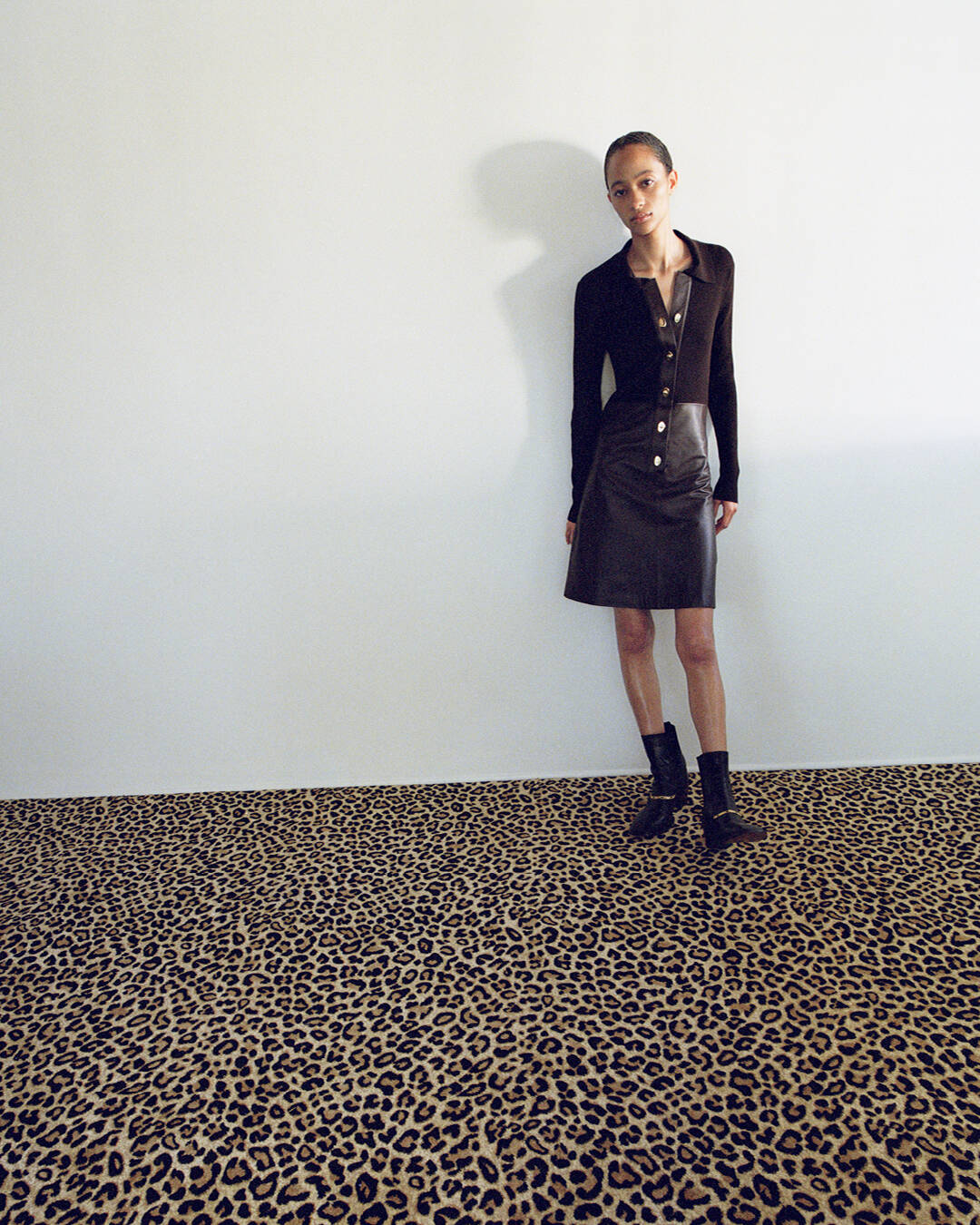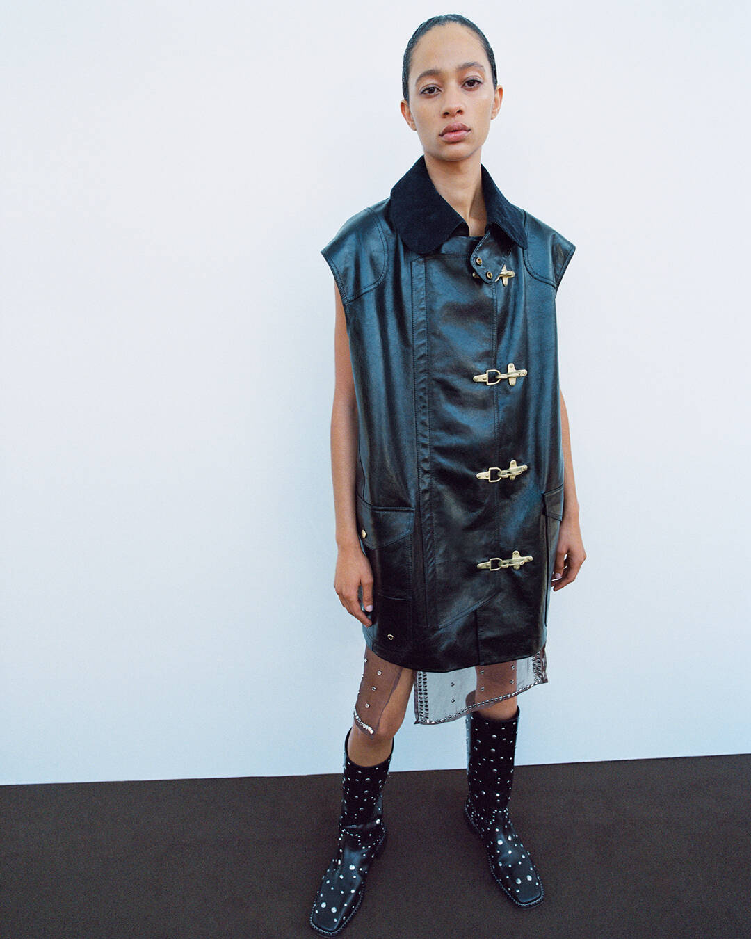 True to form, Bonner composes a wardrobe where refinement and edge walk in step. Masculinity and femininity entwine in silhouettes that balance urbanity with utility. Lavish fringe dresses flounce in measured excess, conjuring the archival glamour of Ebony and Jet, while navy satin and ivory cashmere are cut to captivate. Open-back knits find their counterpoint in biker jackets, the toughness of leather softened by creamy Mongolian shearling – a timeless take on the trending jacket.