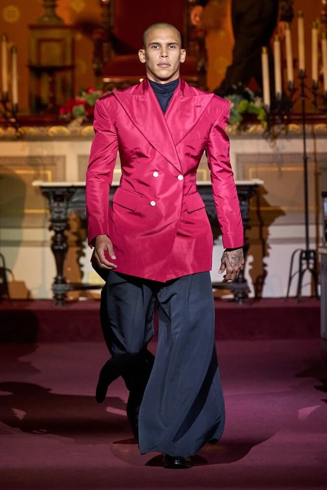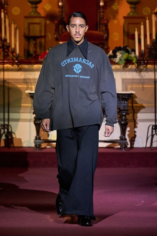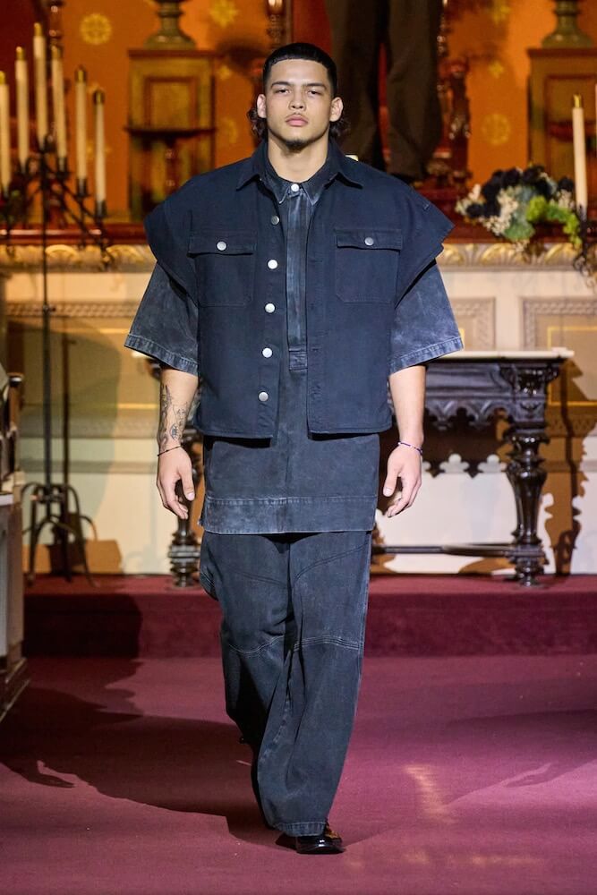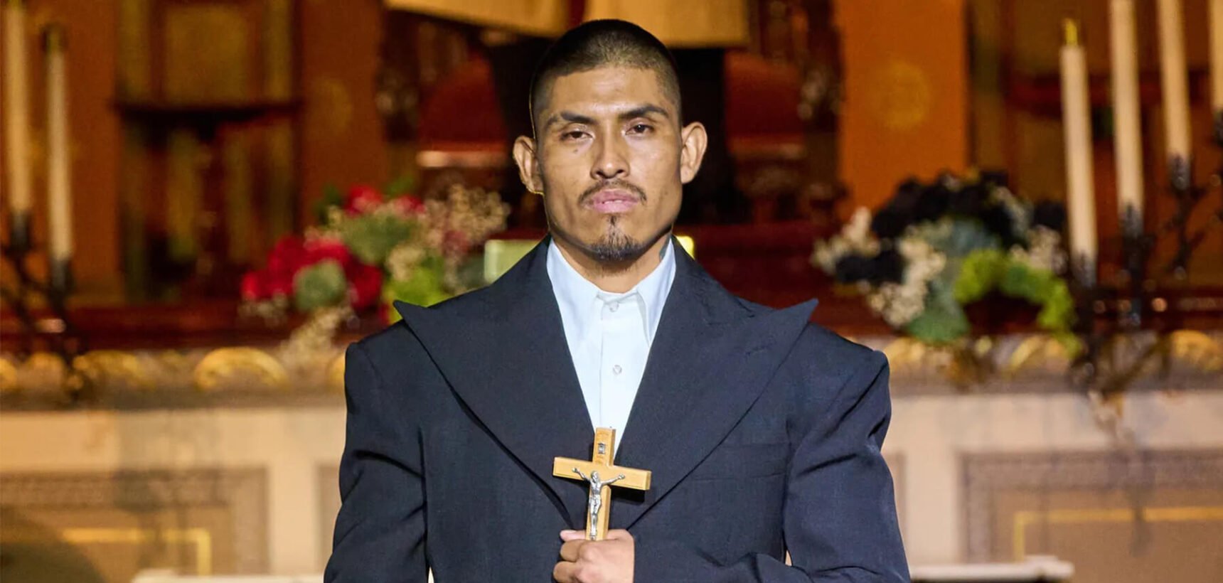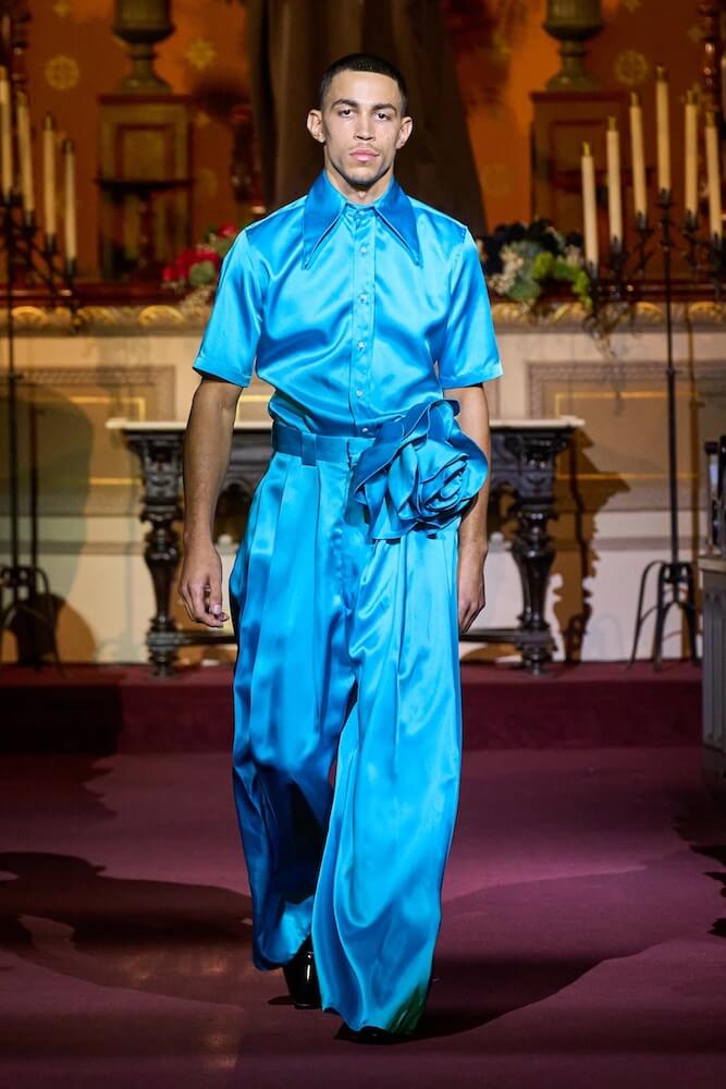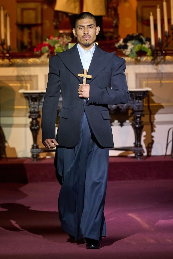 Willy Chavarria is an iconoclastic creator, tackling societal issues and religious themes on the reg’. And with his SS23 menswear offering he really said, “take me to church” – not just because the ecclesiastic set was christened within the grand nave of the Marble Collegiate Church in Manhattan, the clothes felt like sacred vestments as well. The first man to walk even clutched a crucifix in the center of his chest, literally portraying this divinity that permeates Chavarria’s work.