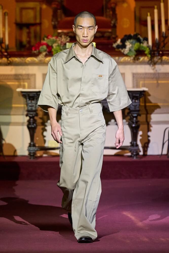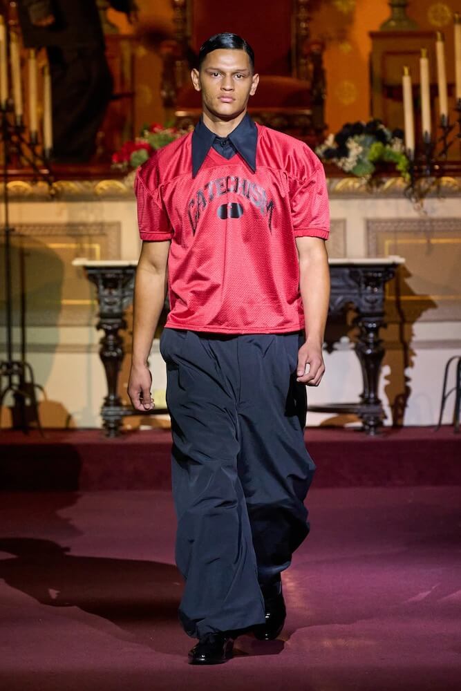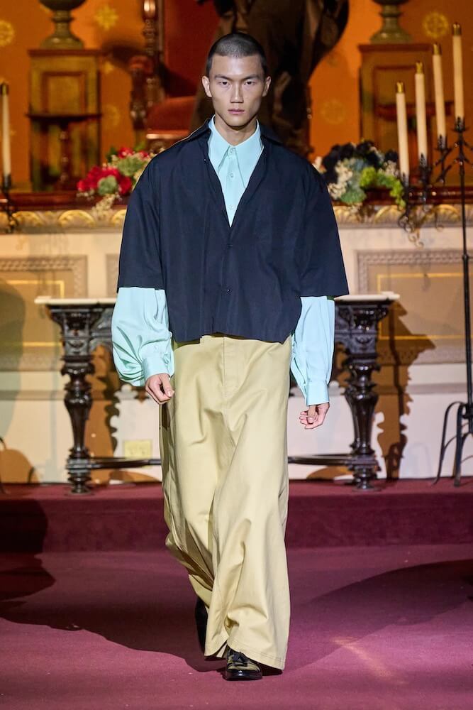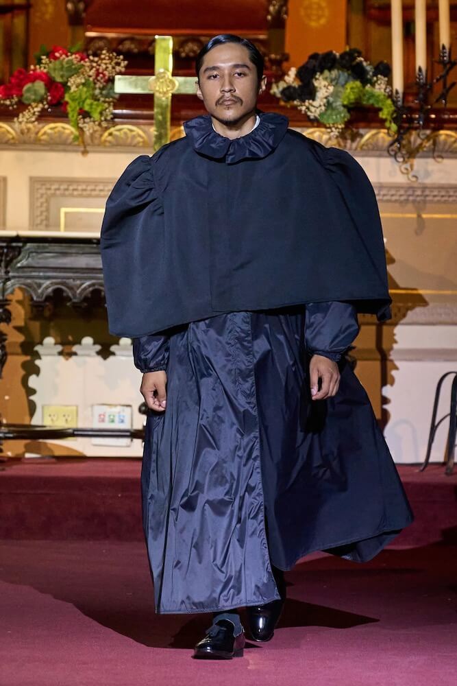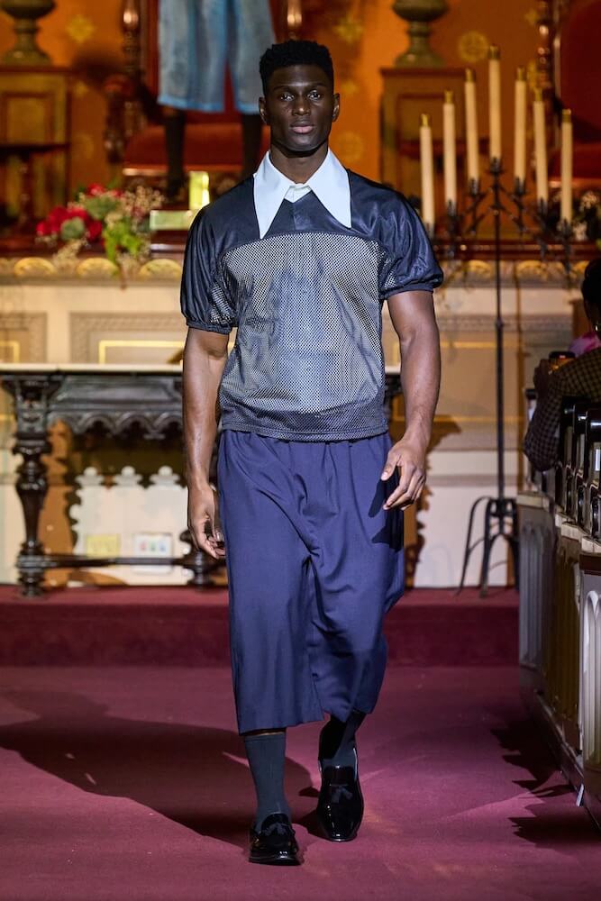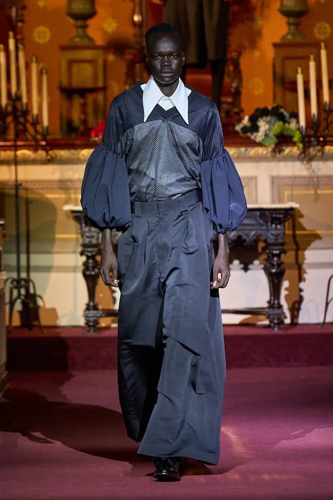 Willy Chavarria is an iconoclastic creator, tackling societal issues and religious themes on the reg’. And with his SS23 menswear offering he really said, “take me to church” – not just because the ecclesiastic set was christened within the grand nave of the Marble Collegiate Church in Manhattan, the clothes felt like sacred vestments as well. The first man to walk even clutched a crucifix in the center of his chest, literally portraying this divinity that permeates Chavarria’s work.