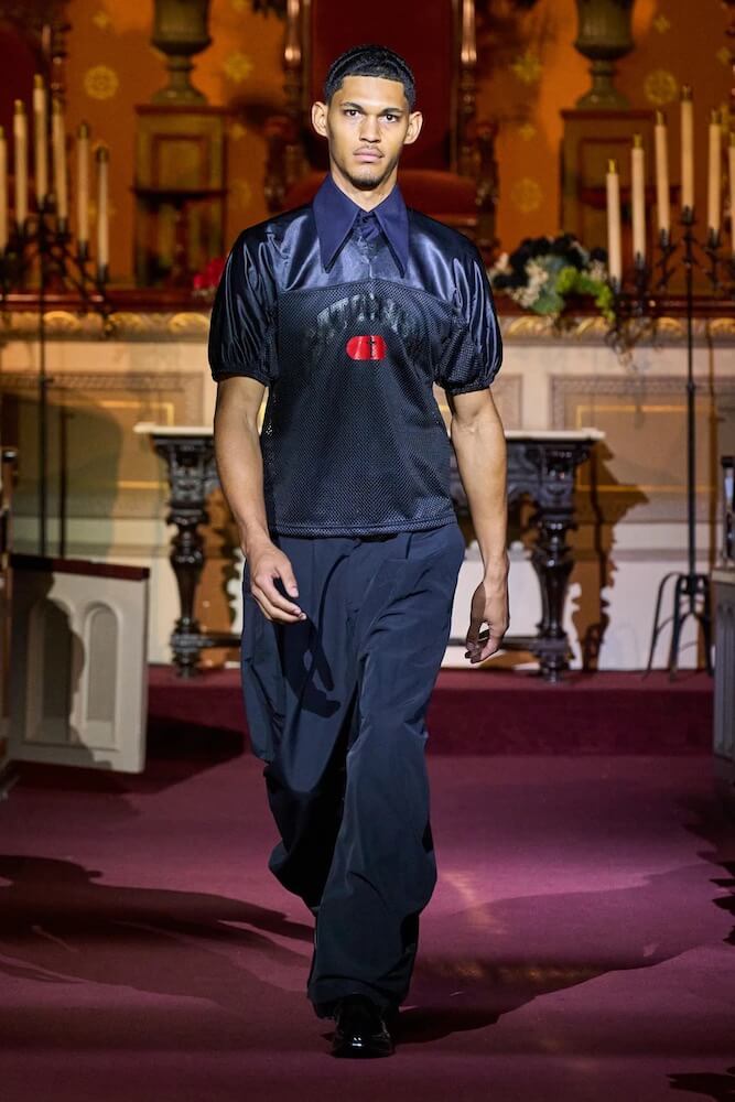 Then, just as the catwalk came to a close, a queer compilation of feminine yet sporty garms appeared. Graphic American football shirts with princessy puff sleeves were crafted from satin and organza.