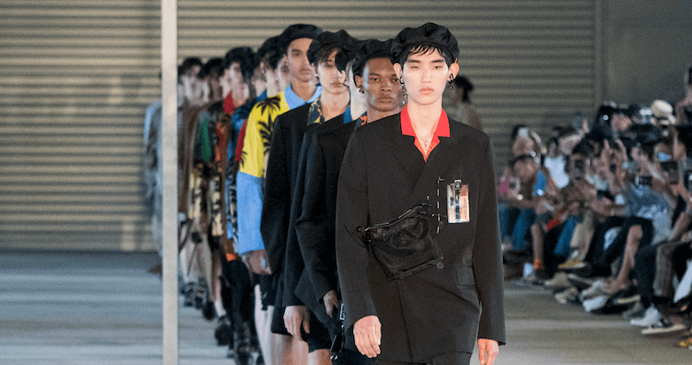The line-out, set next to the Seine, of hazy palm tree print shirts and heritage-check trousers and huge-shoulder jackets will speak directly to the designers’ fashion fans. Their understanding of what customers want now is why this South Korean label has such a global resonance. The chocolate ciré shorts worn with a picture-print red hoody (nice touch with the hiking rope pull) and built-up strappy sandals, and any of the ombré bleach denim pieces, have the kind of “add to cart” energy that keeps her Gen Z-devotees shopping. Retailers will invest in the brand’s cross-bags with superimposed sunshine scene. This bag-style has cracked it. Anything worn cross-body has caught the imagination of a whole generation of young male shoppers and this is next gen shopping.