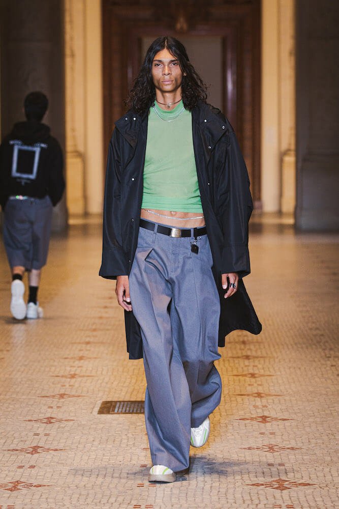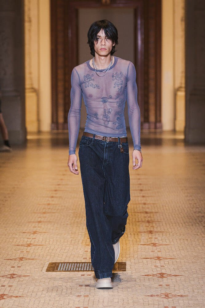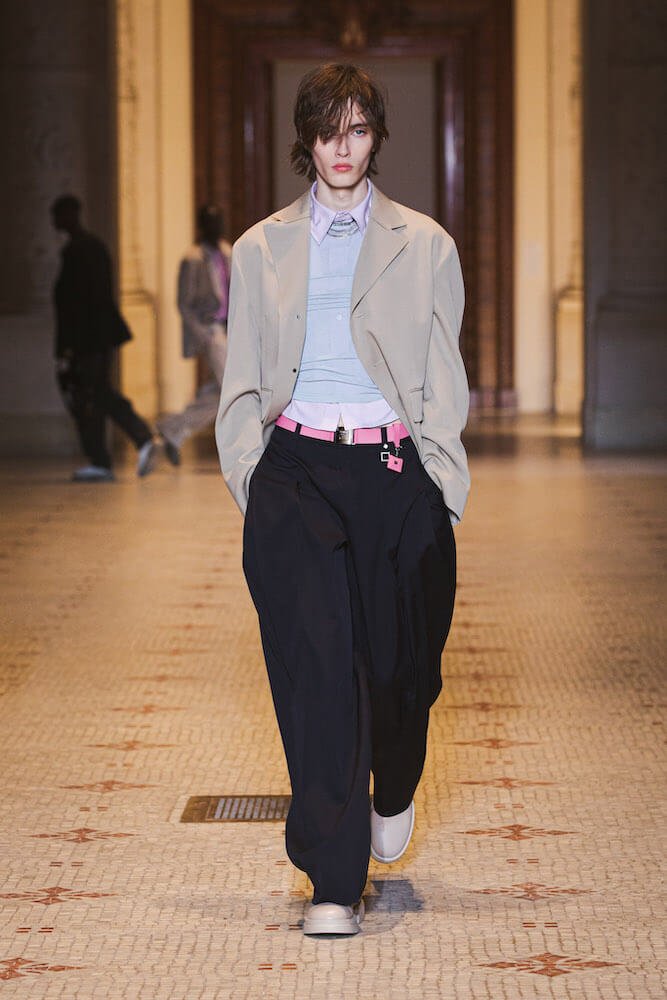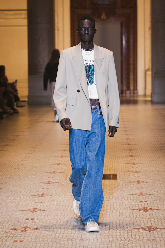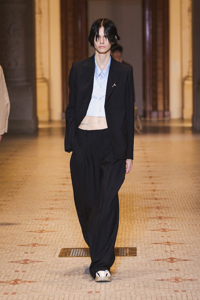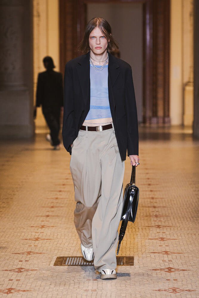 Framed by the grand gallery backdrop of Les Arts Décoratifs, the showcase implied the frenzied bourgeois atmosphere one might expect from a live-action auction, rendering the process of renewal prodigious. However, linked to the likeness between those old enough to know The OC and the TikTok famous tots of today, it was also fuelled by the nostalgia of social media and the catharsis of Y2K. The resulting clothes, built from memories of early incarnations, boasted baggy hip hop-inspired cargos, double-breasted jackets with second skin tees underlaid, pleated trousers, cropped shirts or blazers paired with slouchy wide-leg trousers, and a full spectrum of washed denim.