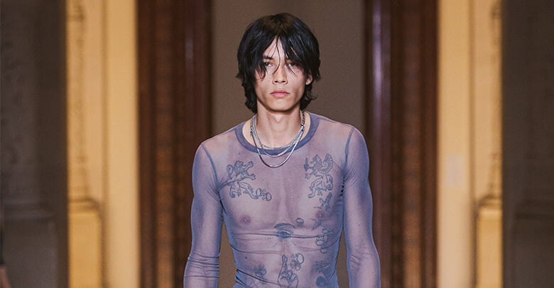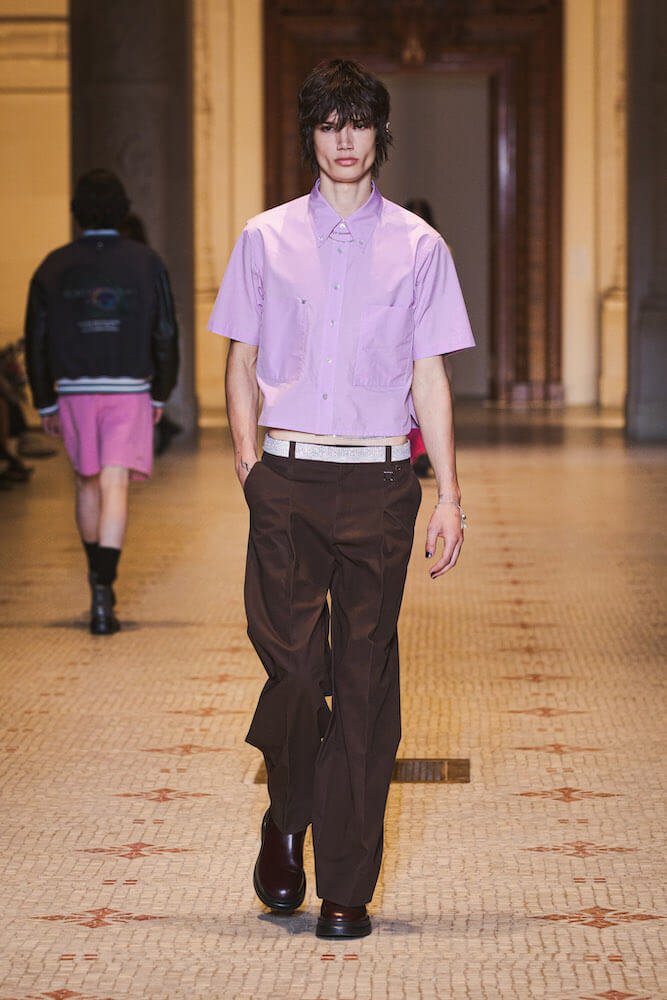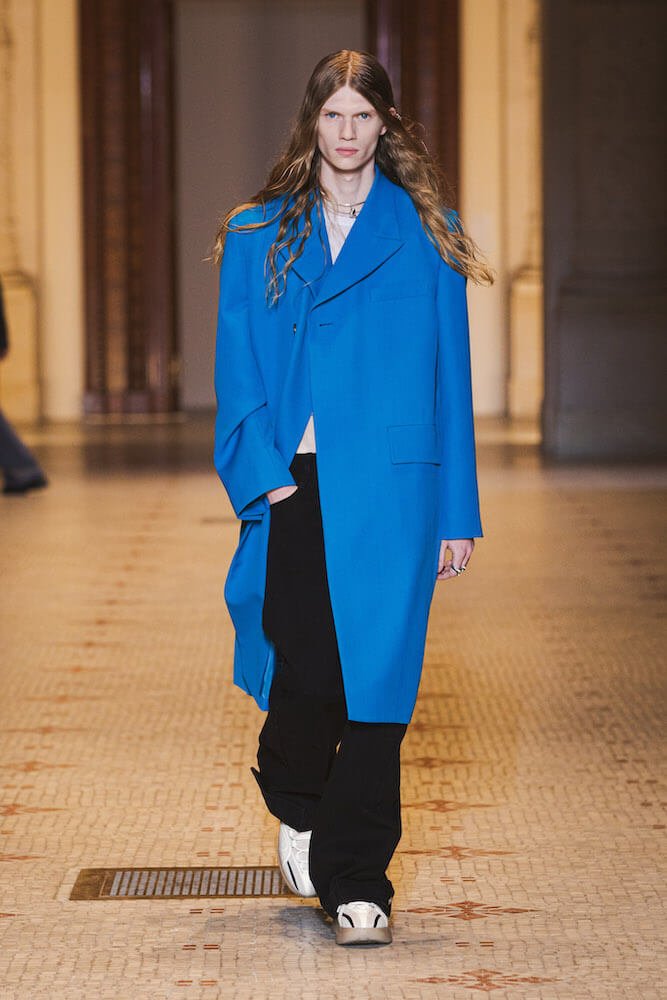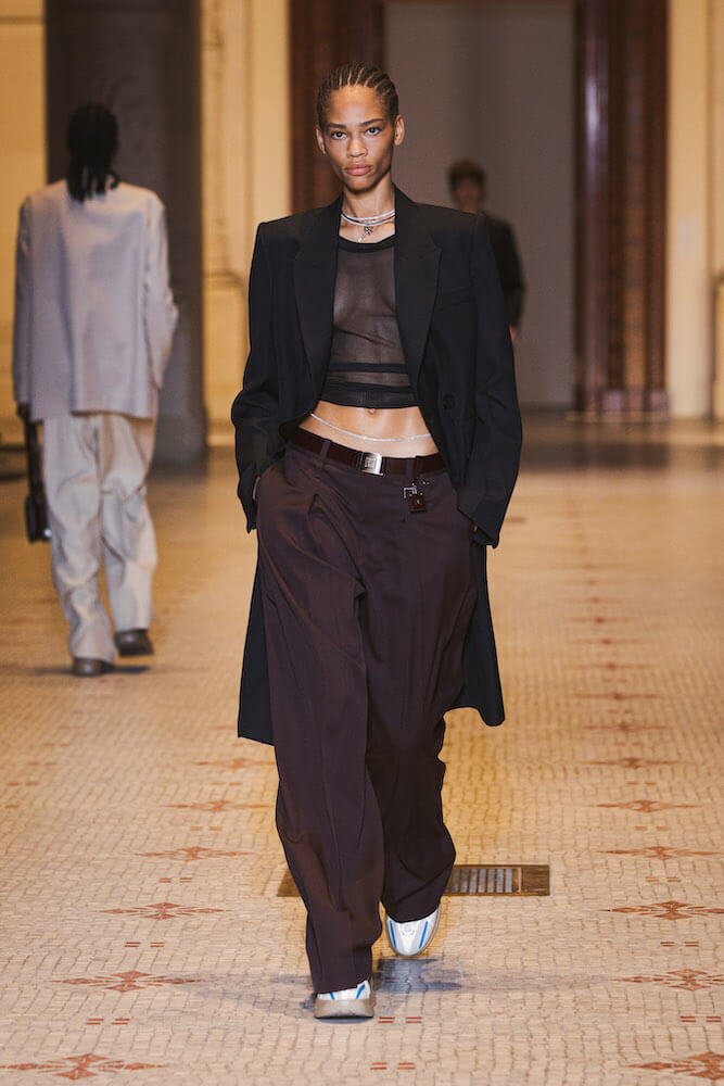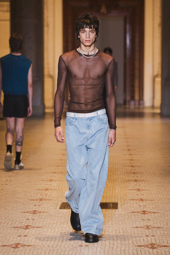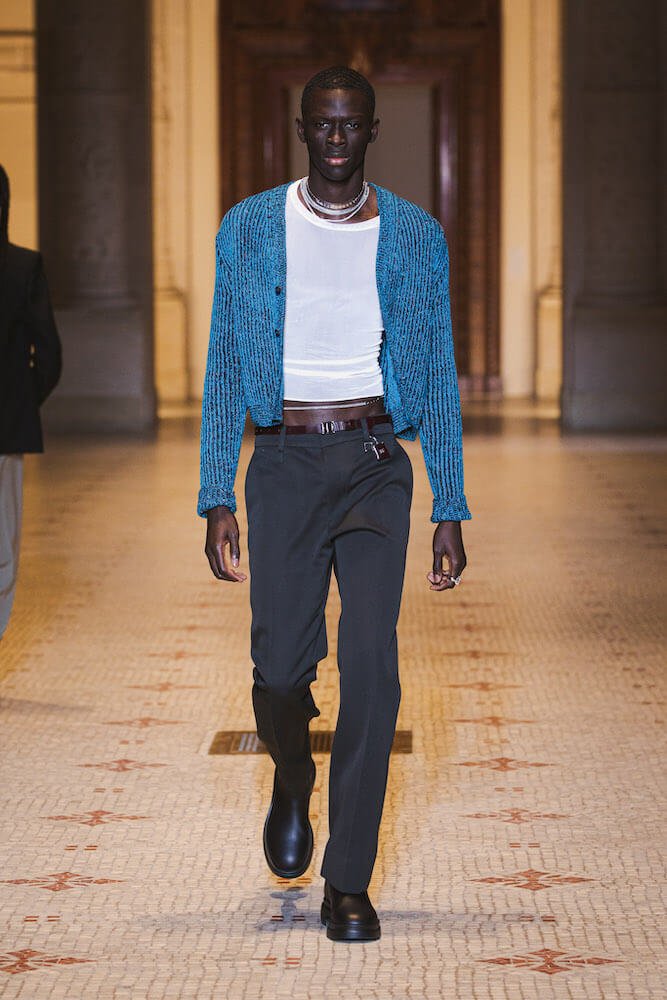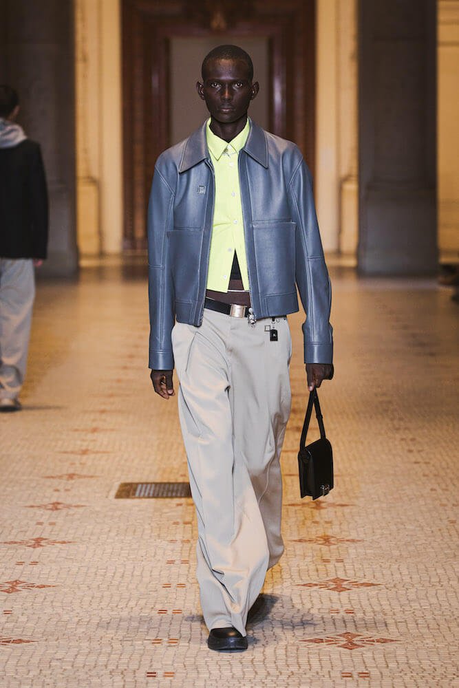 Framed by the grand gallery backdrop of Les Arts Décoratifs, the showcase implied the frenzied bourgeois atmosphere one might expect from a live-action auction, rendering the process of renewal prodigious. However, linked to the likeness between those old enough to know The OC and the TikTok famous tots of today, it was also fuelled by the nostalgia of social media and the catharsis of Y2K. The resulting clothes, built from memories of early incarnations, boasted baggy hip hop-inspired cargos, double-breasted jackets with second skin tees underlaid, pleated trousers, cropped shirts or blazers paired with slouchy wide-leg trousers, and a full spectrum of washed denim.