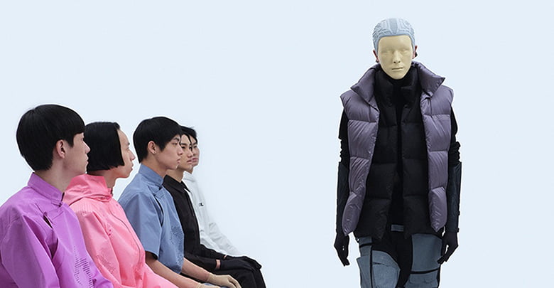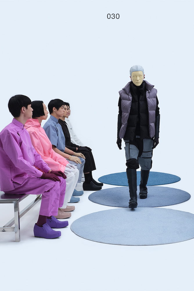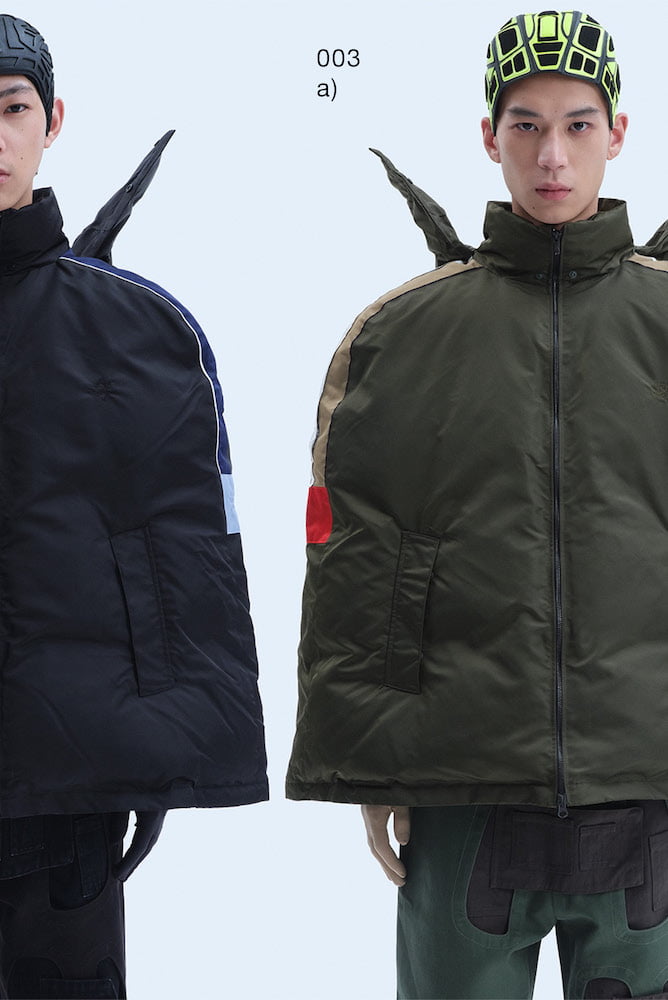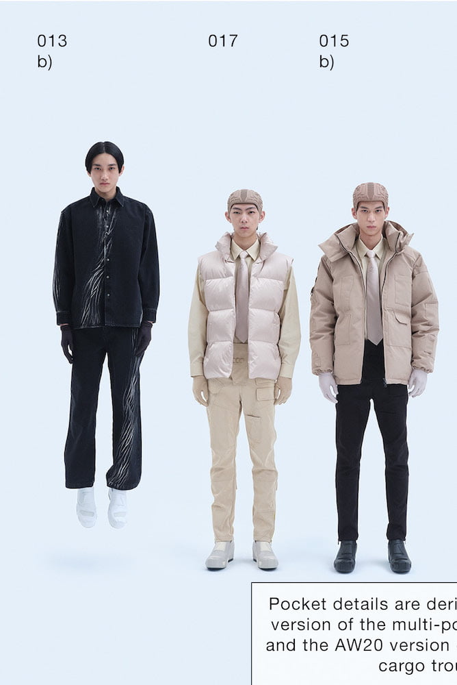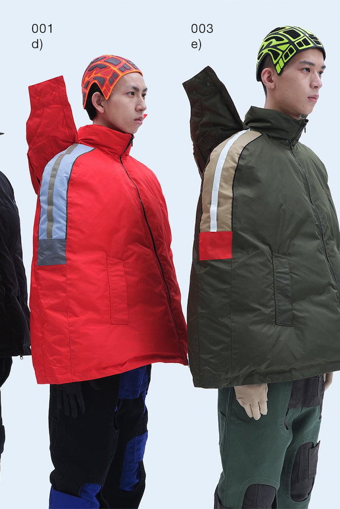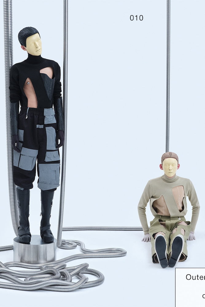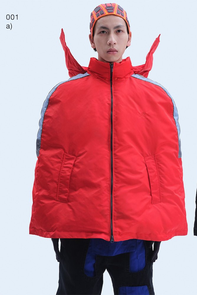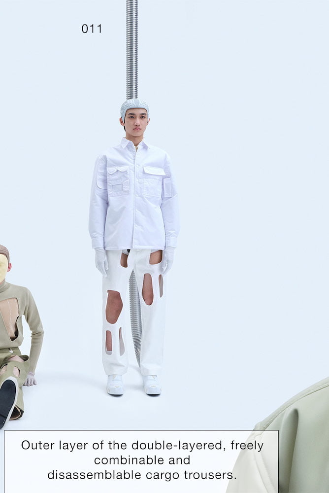 So what’s new? Playing with form and function, Xander Zhou creates a HUMANoidWEAR uniform suit that varies in colour as the human body naturally changes in temperature. Detachable and shapeable shoulder pads in modified collared shirts mingle throughout the collection, with multi-pocket garments and freely combinable and disassemble-able cargo trousers.