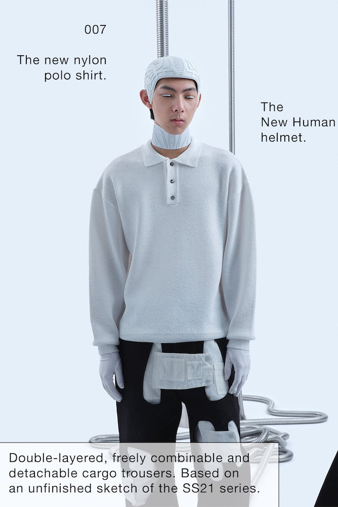 Revelling in functionality, utilitarian aesthetics, and unconventional materials embedded by advanced technology, Xander Zhou has fabricated his way into the future. The designer’s imaginative innovations and futuristic modernity are at the fore of his collection this autumn/winter 2021 season. Think acupuncture point jumpers, heat-generating fabric, and three-dimensional ‘New Human’ helmets. Drawing on design features from previous collections like, ‘Homo Multiversalis’ (AW20) and ‘Transcendence’ (SS20), as well as earlier shows, this updated collection focuses on improvements in both performance and experience.