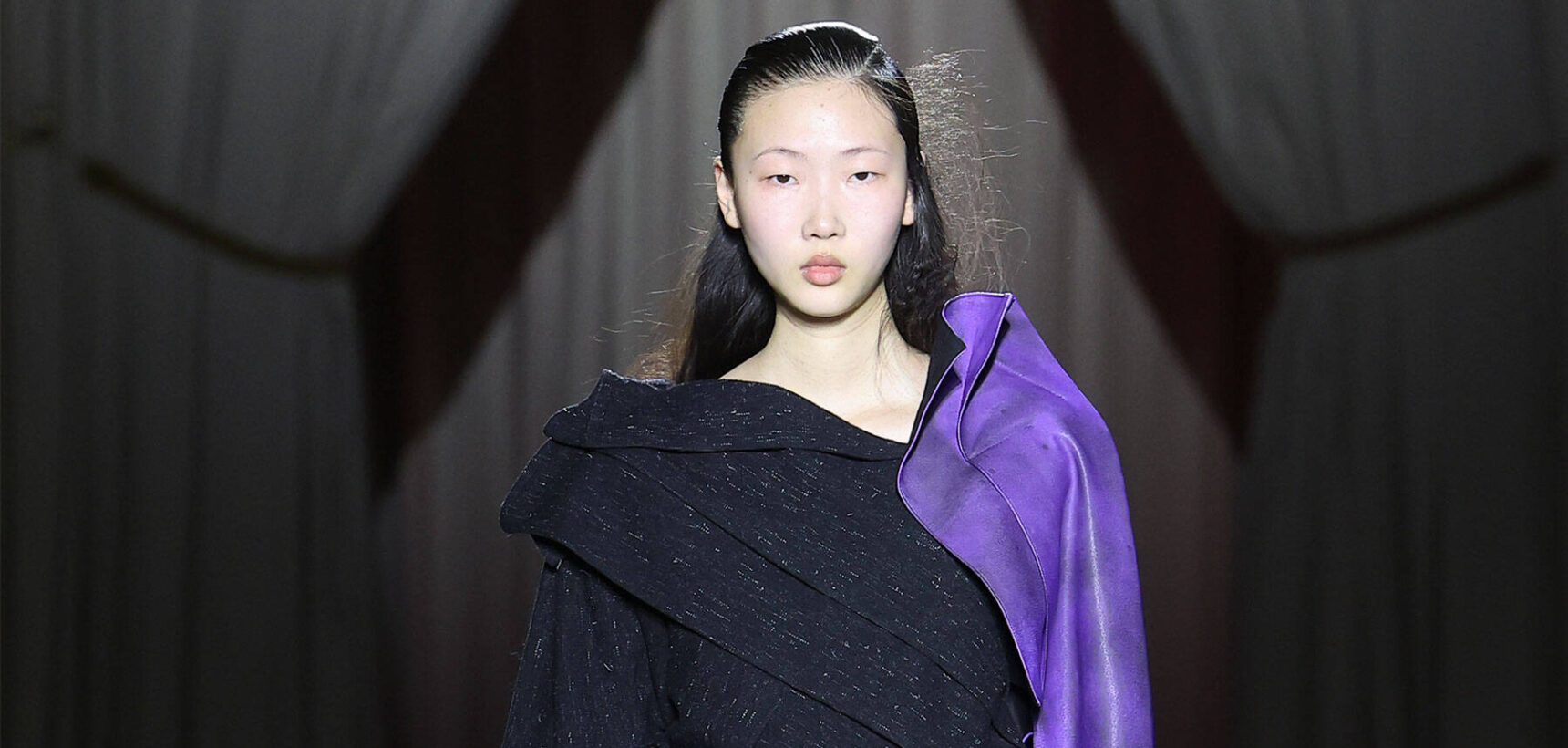 The coats were adorned with geometric shapes in white and purple, while squiggly cords crossed the torso, lending a sculptural quality to the pieces. Some featured patch-worked corsets, designed not to shape the body but to bring the fabric closer to it. The collection also included fluid skirts, asymmetric dresses and voluminous trousers, all grounded with flat shoes that made the extravagant designs feel wearable.