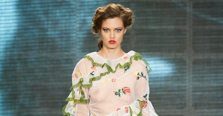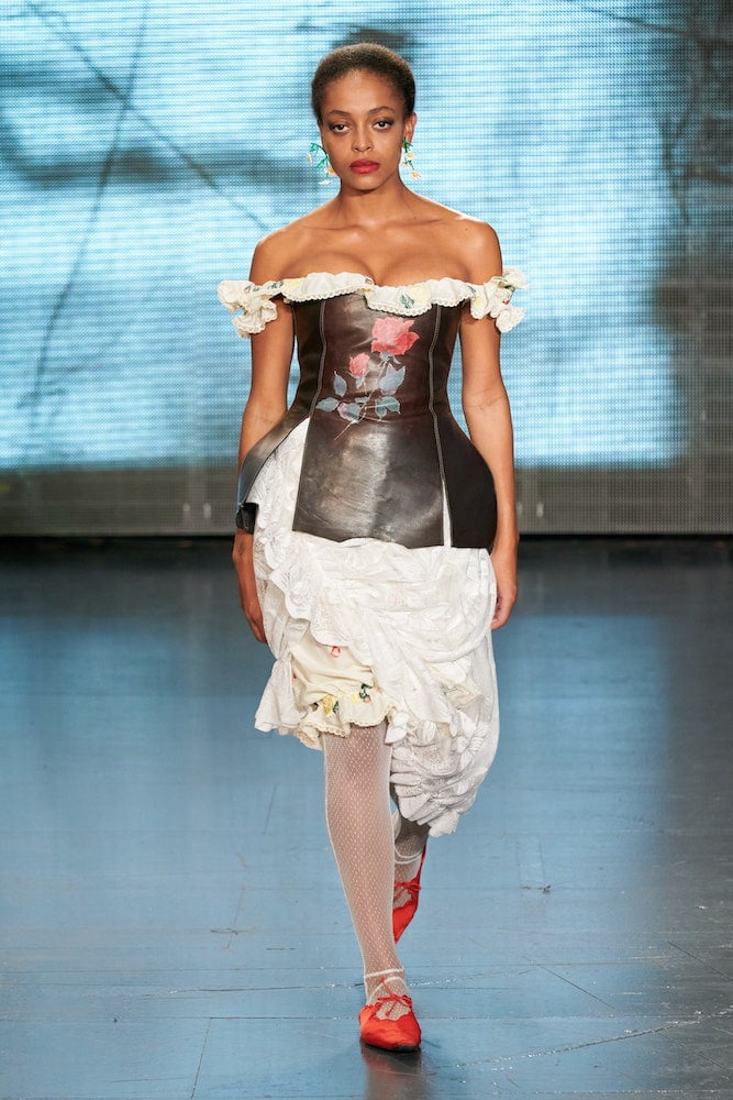 The collection tapped into female vulnerability and the all too common way women live in fear. A theme of sexy femininity and strength donned Wang’s signature ruched dresses, which came covered in colourful nature prints featuring butterflies and unique florals. Sensual lace dresses were covered in pastel hues, embroidered with intricate floral patterns and wrapped in bright 3-D printed gun-shaped leather bumbags.