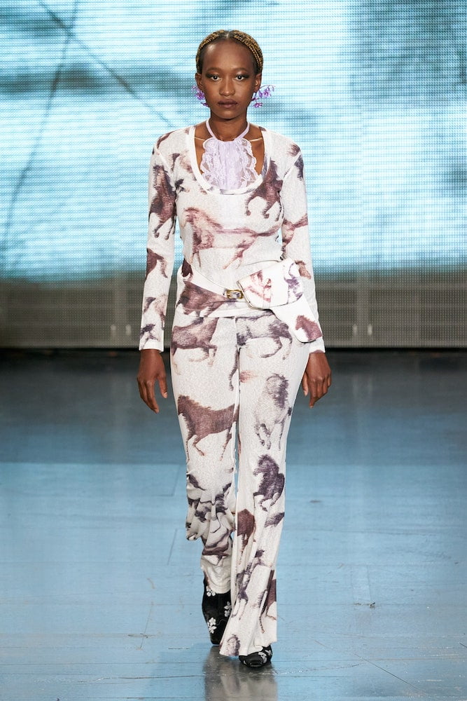 Celebrating female power, Wang looked towards delicacy intertwined with romantic motifs. elegant embroidered faux leather blazers and coats were paired with raw-edged corsets; whilst lace and floral jacquard blouses were seen featuring delicate scalloped edges paired with flowy gored skirts. The collection came covered in hues of pea green, baby blue and lavender, whilst the designer also presented a new seasonal print featuring galloping horses appearing on silk dresses and tube skirts transmitting a sense of freedom across the pieces.