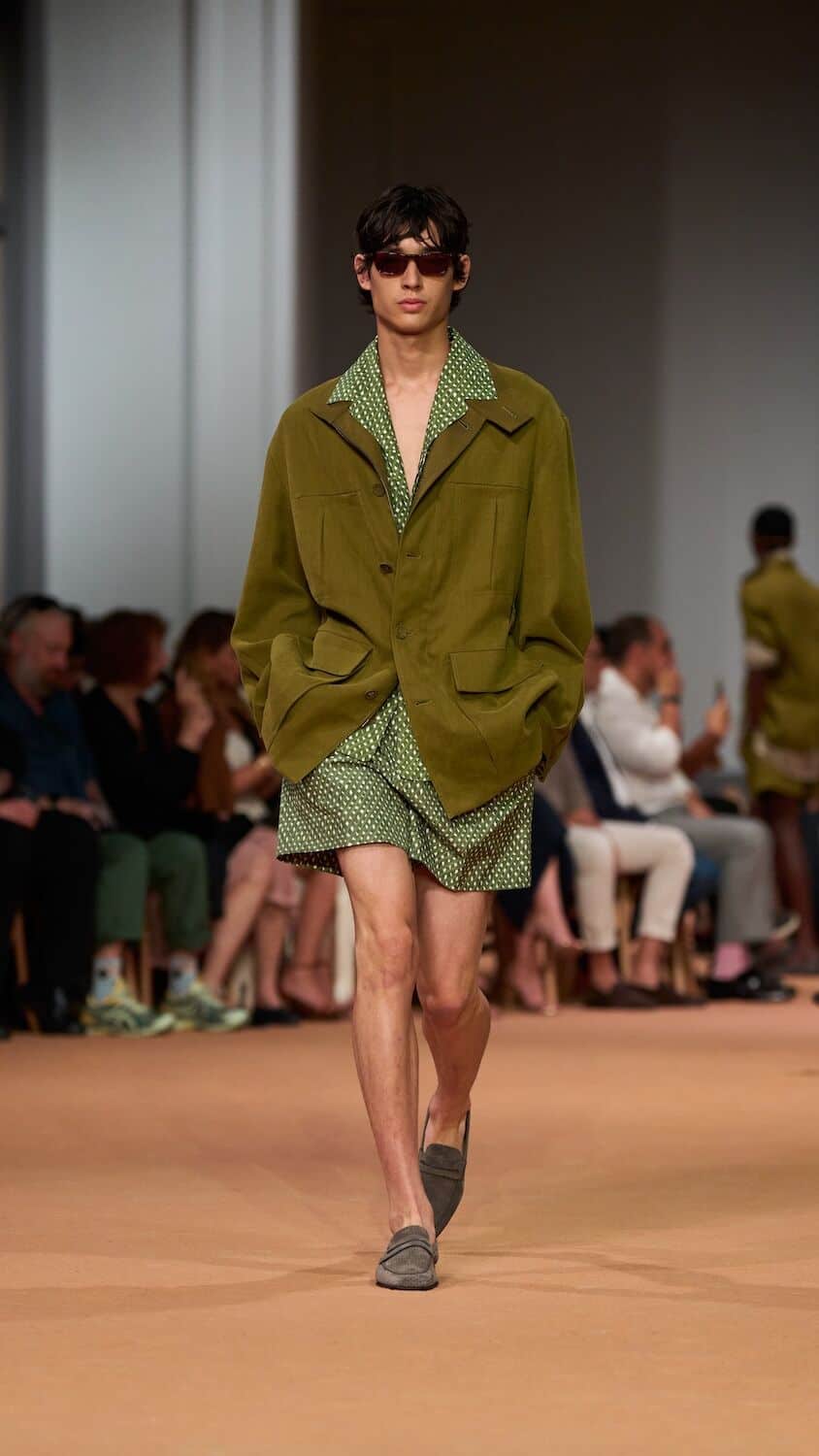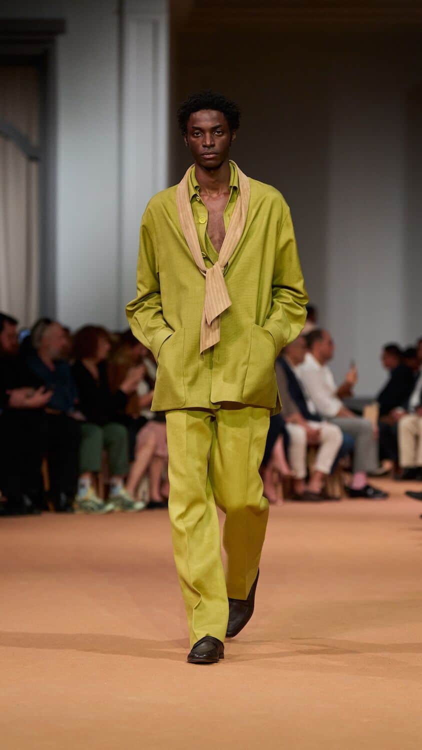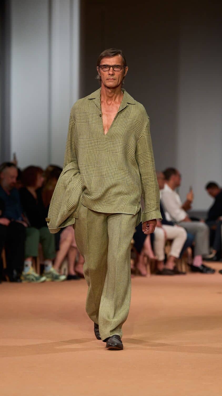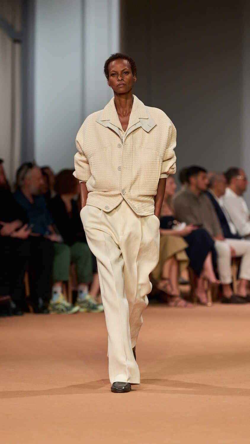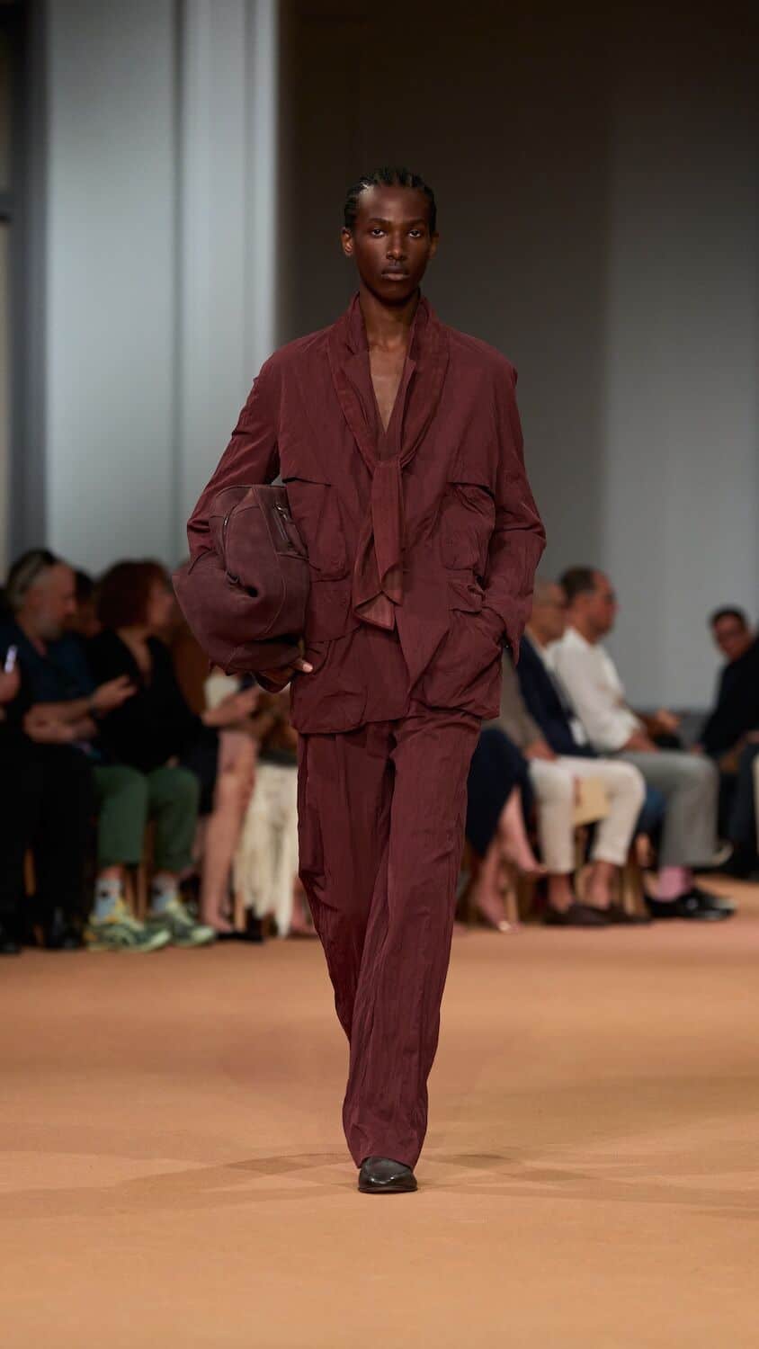 Throughout his tenure at Zegna, Sartori has loosened the constraints of the suit, freeing tailoring of its rigidness with boxy silhouettes and collarless blazers. This time around he proposed relaxed field jackets and cardigans as well as suit jackets that were elongated with a singular buttonhole close to the naval. Standout pieces came in a palette of earthy greens, dusty pinks and gentle browns and creams that could blend effortlessly into a desert backdrop. The mixing of hand-spun silks, sanded hemp, and lightweight Shetland wool throughout ensured the collection is easily transferable to different climates. Whether it’s a breezy Milanese spring or a scorching Dubai summer, Sartori’s Zegna is a go-to.