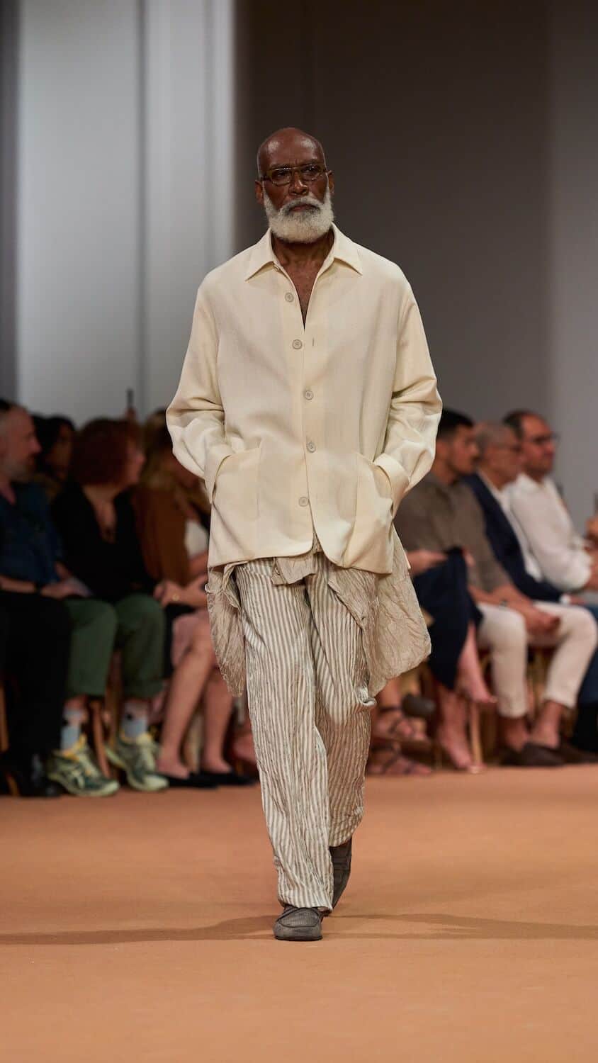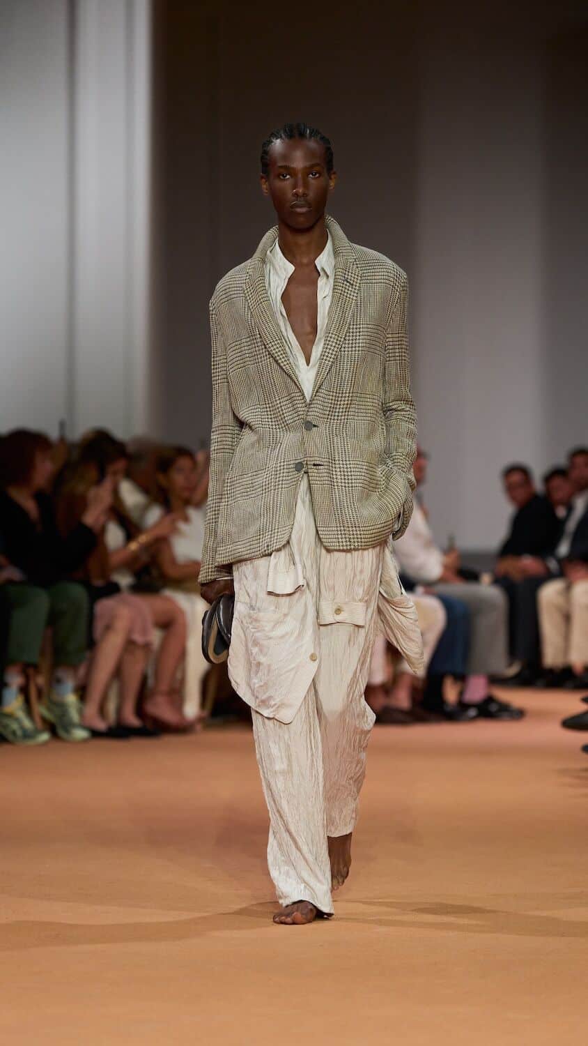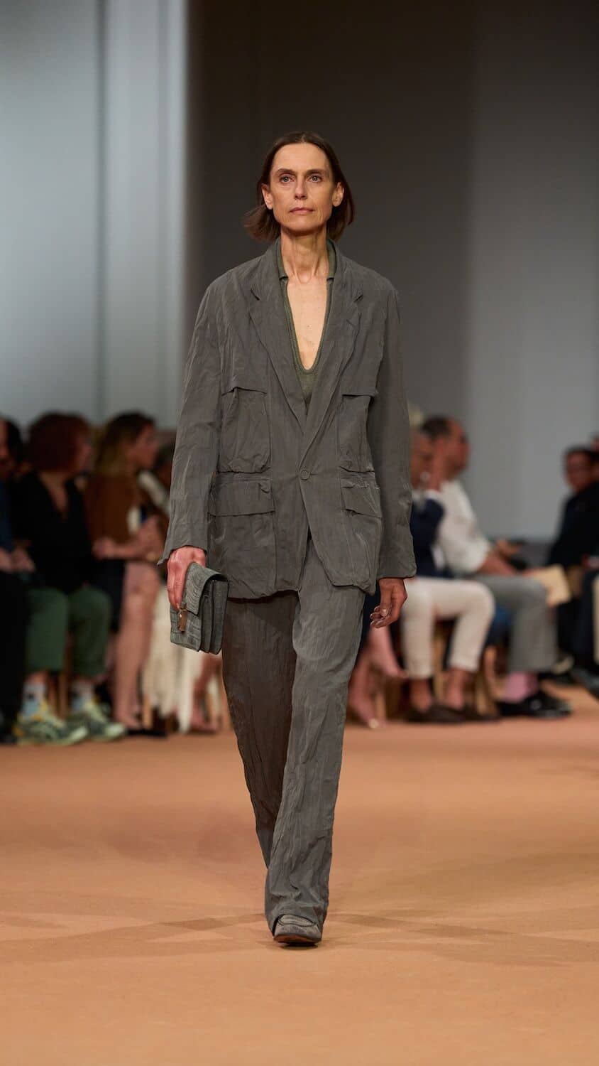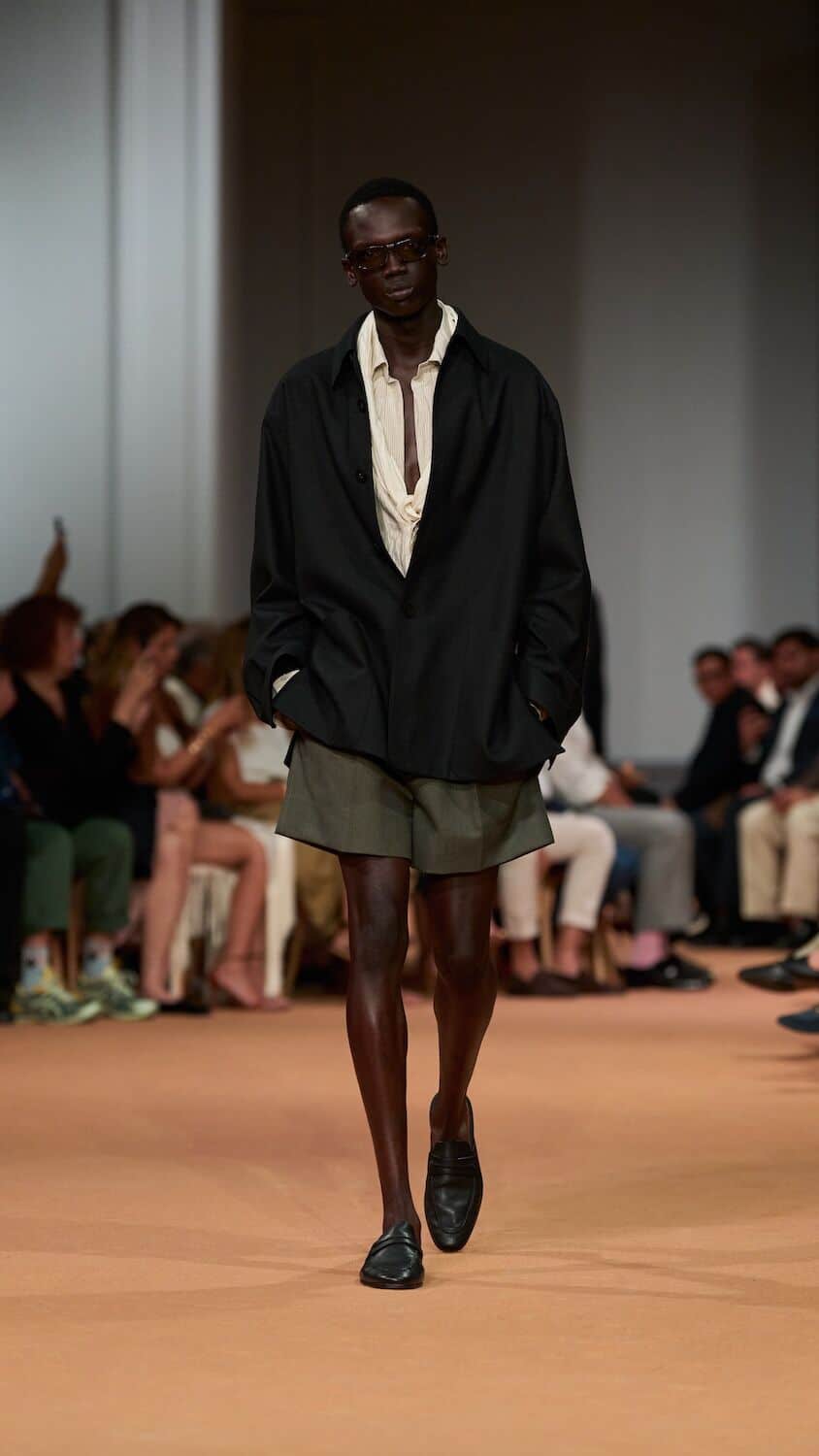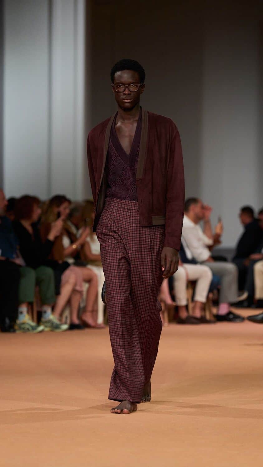 Throughout his tenure at Zegna, Sartori has loosened the constraints of the suit, freeing tailoring of its rigidness with boxy silhouettes and collarless blazers. This time around he proposed relaxed field jackets and cardigans as well as suit jackets that were elongated with a singular buttonhole close to the naval. Standout pieces came in a palette of earthy greens, dusty pinks and gentle browns and creams that could blend effortlessly into a desert backdrop. The mixing of hand-spun silks, sanded hemp, and lightweight Shetland wool throughout ensured the collection is easily transferable to different climates. Whether it’s a breezy Milanese spring or a scorching Dubai summer, Sartori’s Zegna is a go-to.