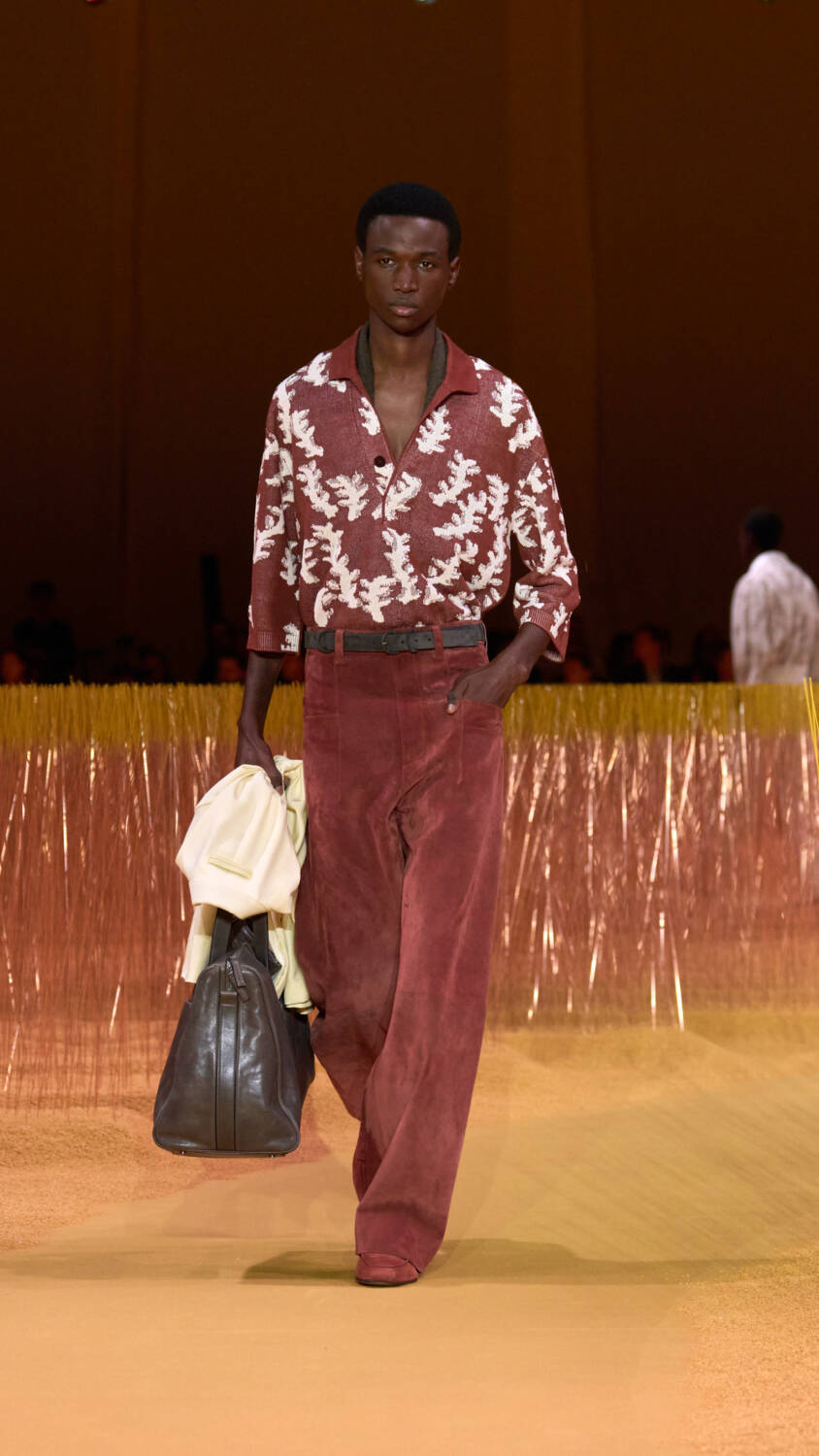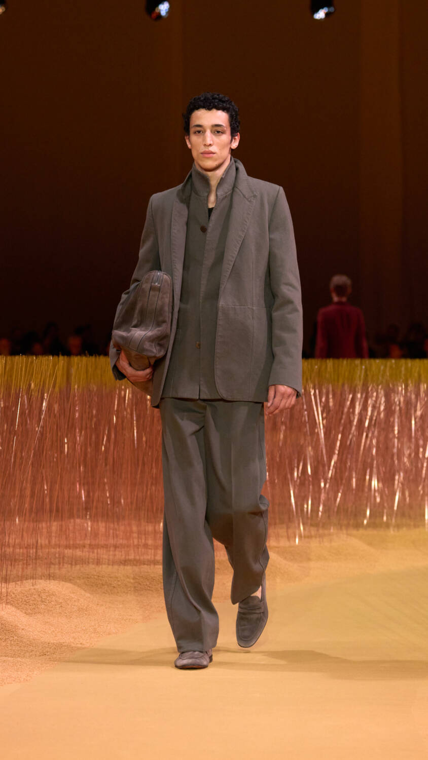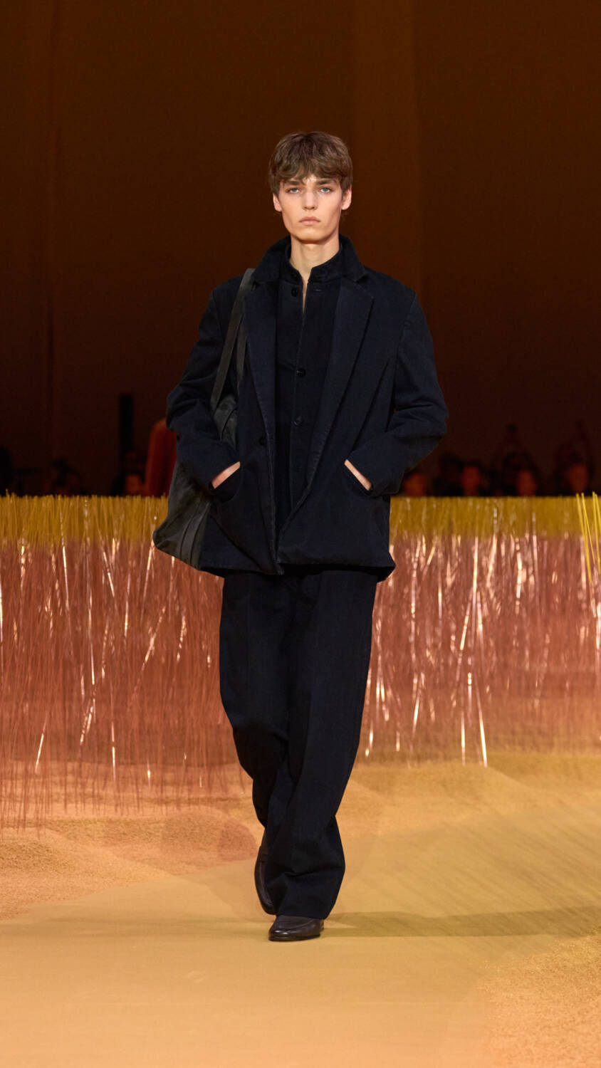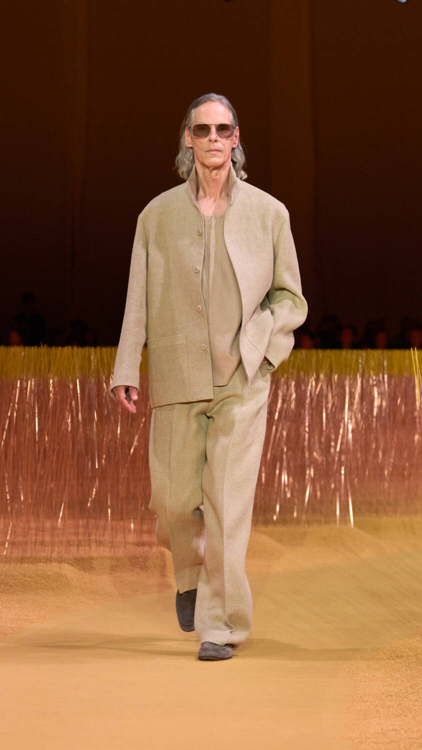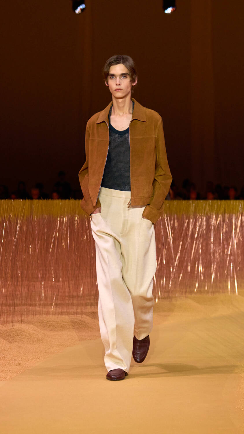 Is there a chicer way to end Milan Fashion Week Men’s than Mads Mikkelsen closing the Zegna show? The handsome actor, who is a global ambassador of the brand, elegantly graced the catwalk in a maroon calf leather jacket with the collar popped, carrying two holdalls in same buttery fabric. He looked as if he’d just touched down in a sunkissed oasis, aided by the show’s set – housed inside a vast warehouse was a golden field of linen, with each fine stem actually constructed from paper-thin metal.